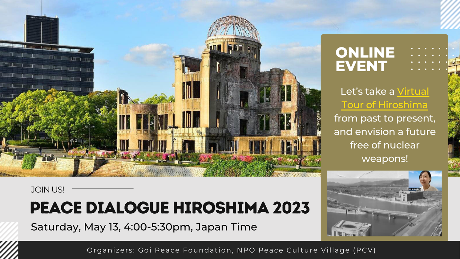 広島平和記念公園バーチャルツアーは、PCVスタッフのナビゲーションにより、デジタル技術で再現された爆心地周辺をオンラインで巡り、原爆投下前の町並みや人々の日常、原爆投下後の被爆の実相や復興の歴史まで広く学びました。