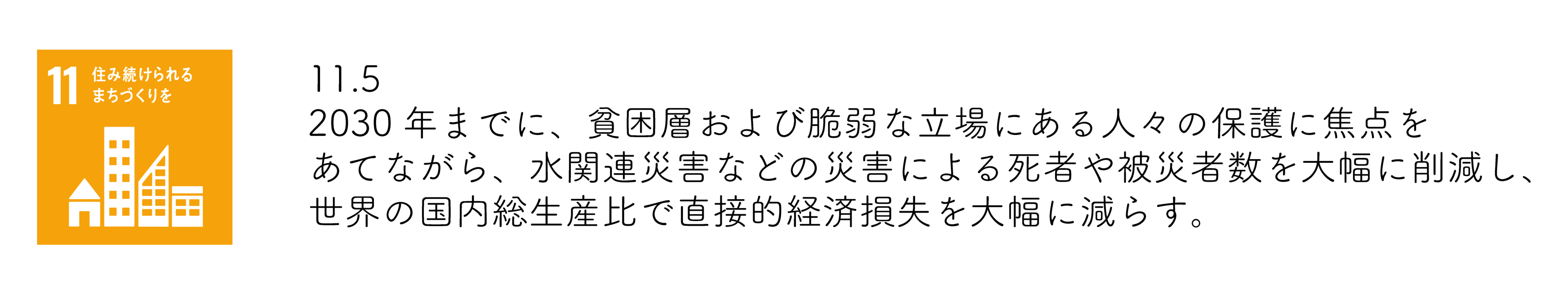 2030年までに、貧困層および脆弱な立場にある人々の保護に焦点をあてながら、水関連災害などの災害による死者や被災者数を大幅に削減し、世界の国内総生産比で直接的経済損失を大幅に減らす。