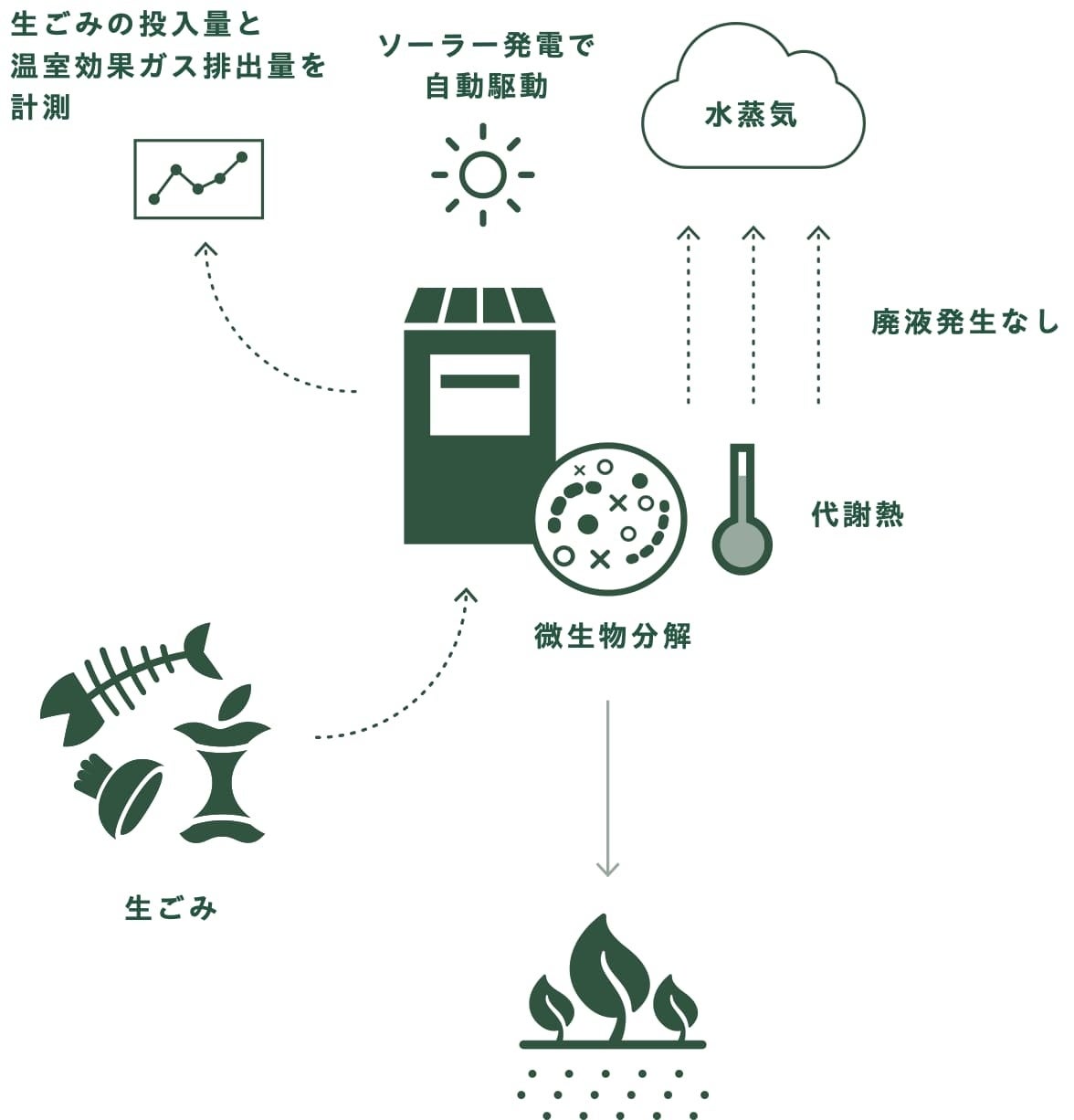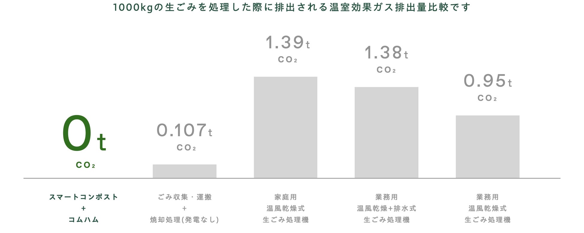 AC電源からの電力に頼らず、ソーラーパネルからの発電とコムハムによる代謝のみで運用が可能です。生ごみ処理にかかる温室効果ガス排出量を実質0で運用できることがスマートコンポストとコムハムを活用することで得られる最大のメリットです。