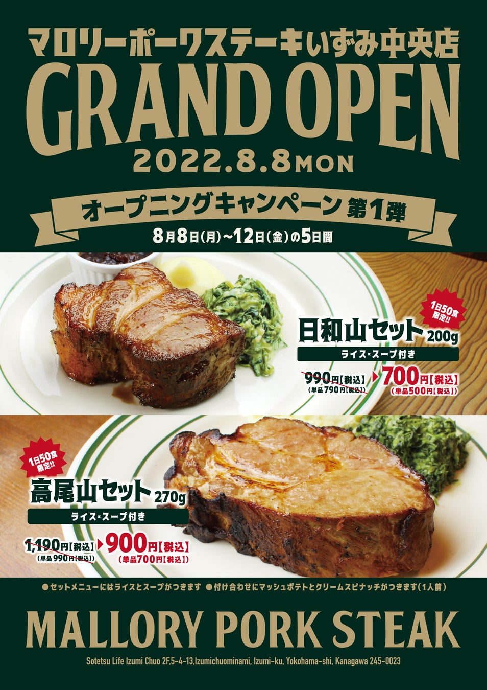 株式会社57(所在地:神奈川県横浜市、代表者 今野健二 取締役 齊藤茂人)が運営する巨大なポークステーキのファストフードをコンセプトにした「マロリーポークステーキ」は6店舗目、初のフランチャイズでの出店となる「マロリーポークステーキ いずみ中央店」を2022年8月8日(月)にオープンいたします(FC加盟オーナー リベラル株式会社)。8月8日(月)〜8月12日(金)の期間は「日和山200g」限定50食を通常790円のところ500円、「高尾山270g」限定50食を通常990円のところ700円でご提供します。