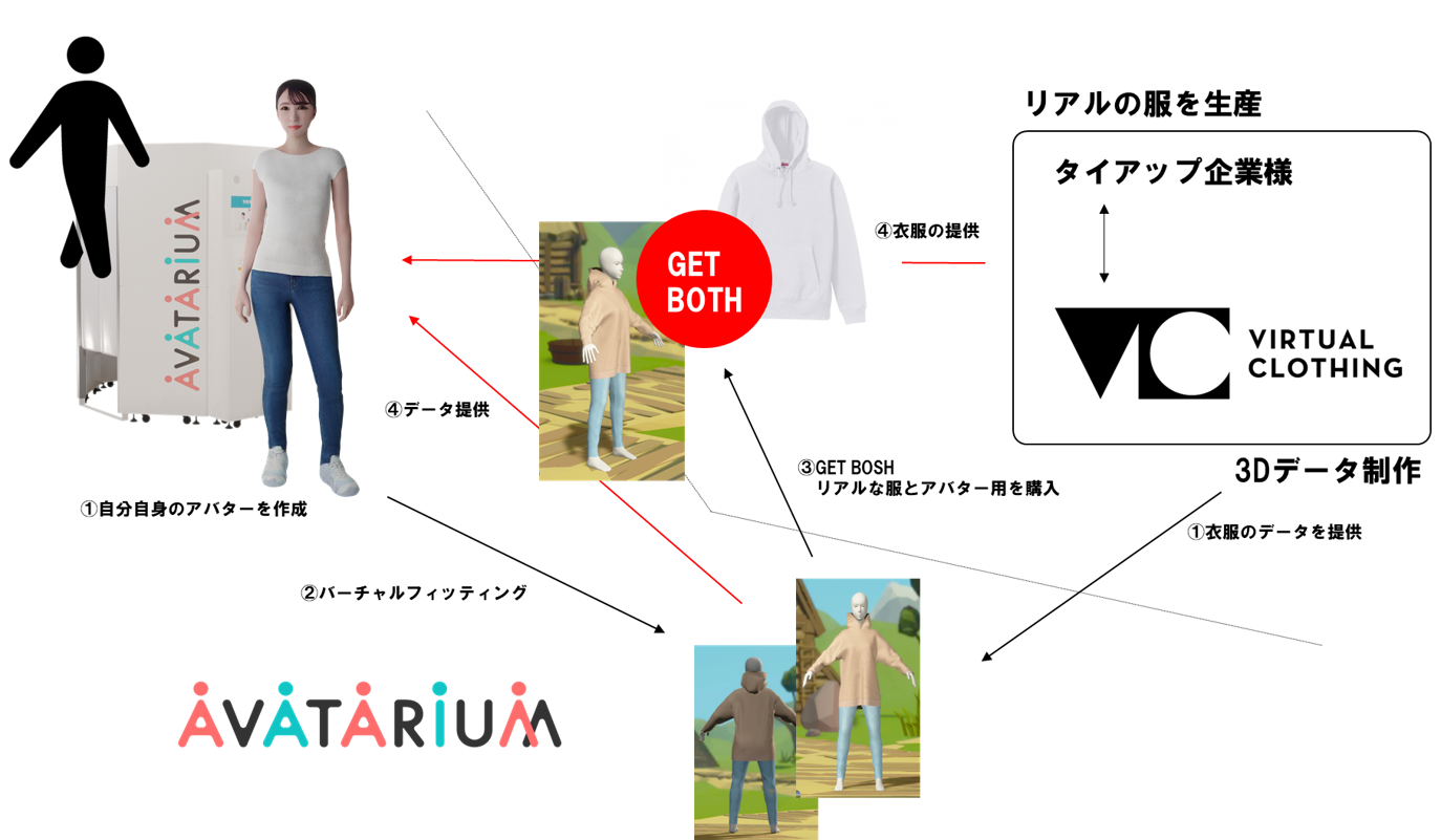 アバターとリアルの人間が同時に衣服を購入し、共に着せ替えを楽しむGET BOTHの世界観を体感してください。