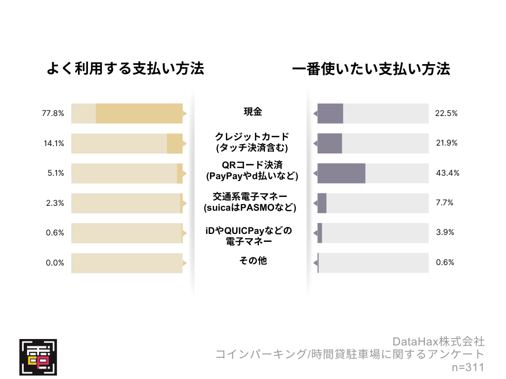 一方で、「Q.コインパーキング/時間貸駐車場で一番使いたい決済方法を教えてください。」(n=311)と質問したところ、「QRコード決済(PayPayやd払いなど)」43.4%、「クレジットカード(タッチ決済含む)」21.9%と高い支持を受ける結果となり、「現金」の支持率は22.5%と実態とは真逆の結果となりました。