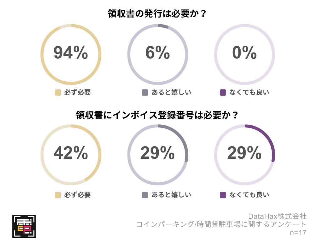 事業用車でコインパーキングを利用される人に「Q.コインパーキング/時間貸駐車場で領収書の発行は必要ですか?」(n=17)と質問したところ、「必ず必要」が94.1%、「あるとうれしい」が5.9%で、「なくても良い」の回答は0%でした。