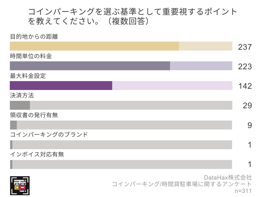 「Q.CPを選ぶ基準として重要視するポイントを教えてください。(複数回答)」(n=311)と質問したところ、「目的地からの距離」76.2%と「時間単位の料金(30分で〇〇円など)」71.7%が高い割合となり、「最大料金設定」が45.7%と続きました。