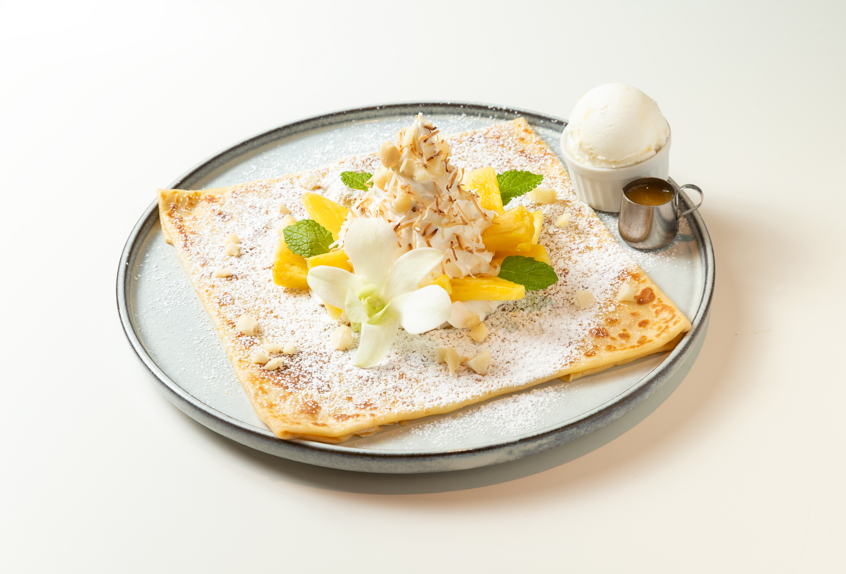 食事系クレープを食べた後にもデザートにペロッと食べられる一枚。別添えのパッションフルーツソースや、冷たいココナッツ&パイナップルアイスクリームと一緒に食べると、また違ったテイストを楽しめます。マカダミアナッツの食感も楽しい一枚です。