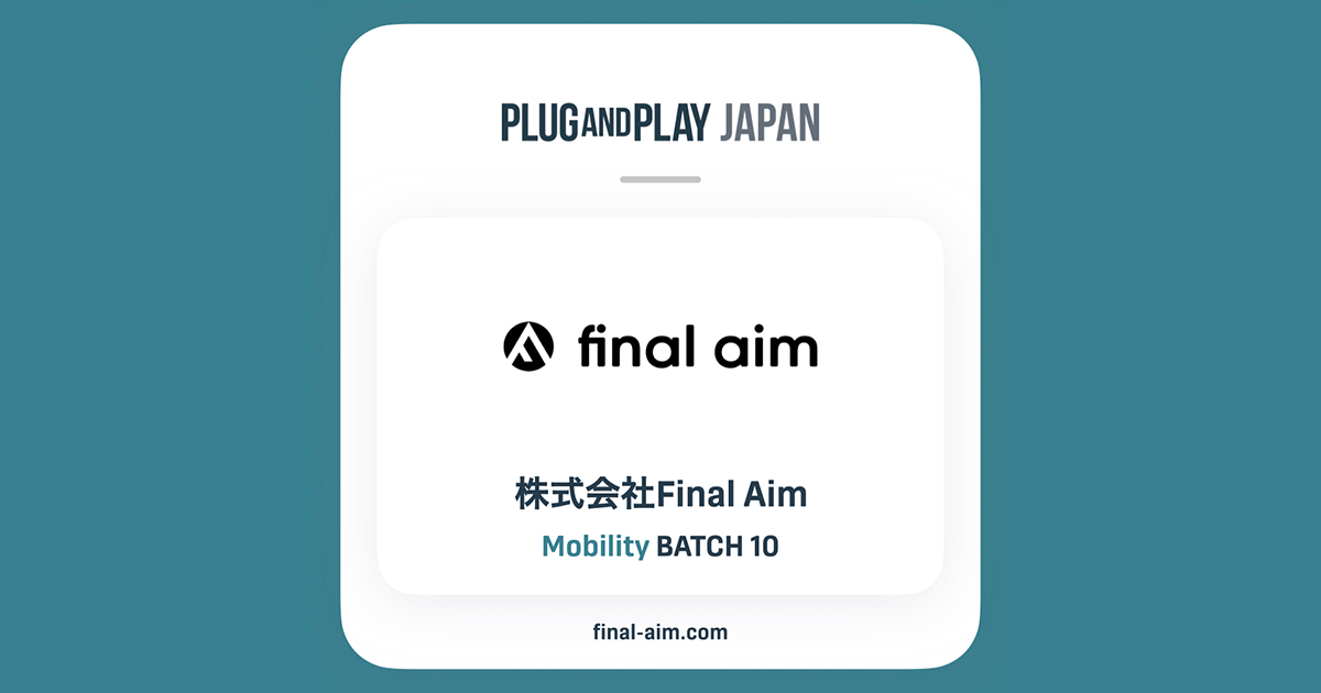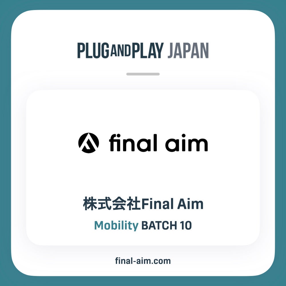 株式会社Final Aim(代表取締役社長:朝倉雅文、取締役:横井康秀、以下Final Aim)は、Plug and Play Japan株式会社(本社:東京都渋谷区、代表取締役社長:ヴィンセント・フィリップ、以下Plug and Play Japan)が実施するアクセラレータープログラムWinter/Spring 2023 BatchのMobilityアクセラレータープログラムに採択されたことを発表いたします。本プログラムをとおして、同アクセラレーターが強みとする大手企業との共創を進めてまいります。