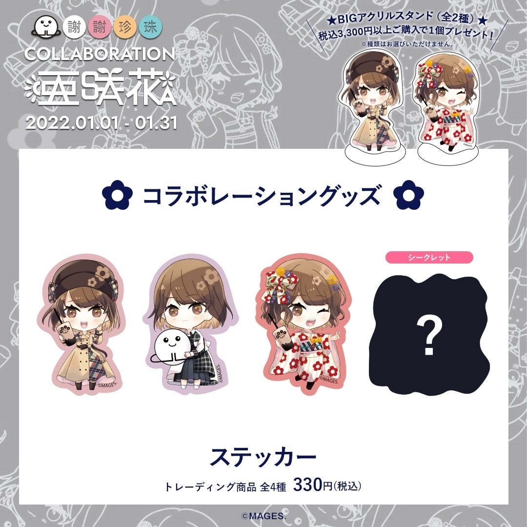また、1回のお会計でコラボドリンクを1点以上含む税込3,300円以上ご購入のお客様には、BIGアクリルスタンドをプレゼント♪新曲衣装とお正月ならではの振袖衣装の2種類をご用意!(絵柄は選べません。)