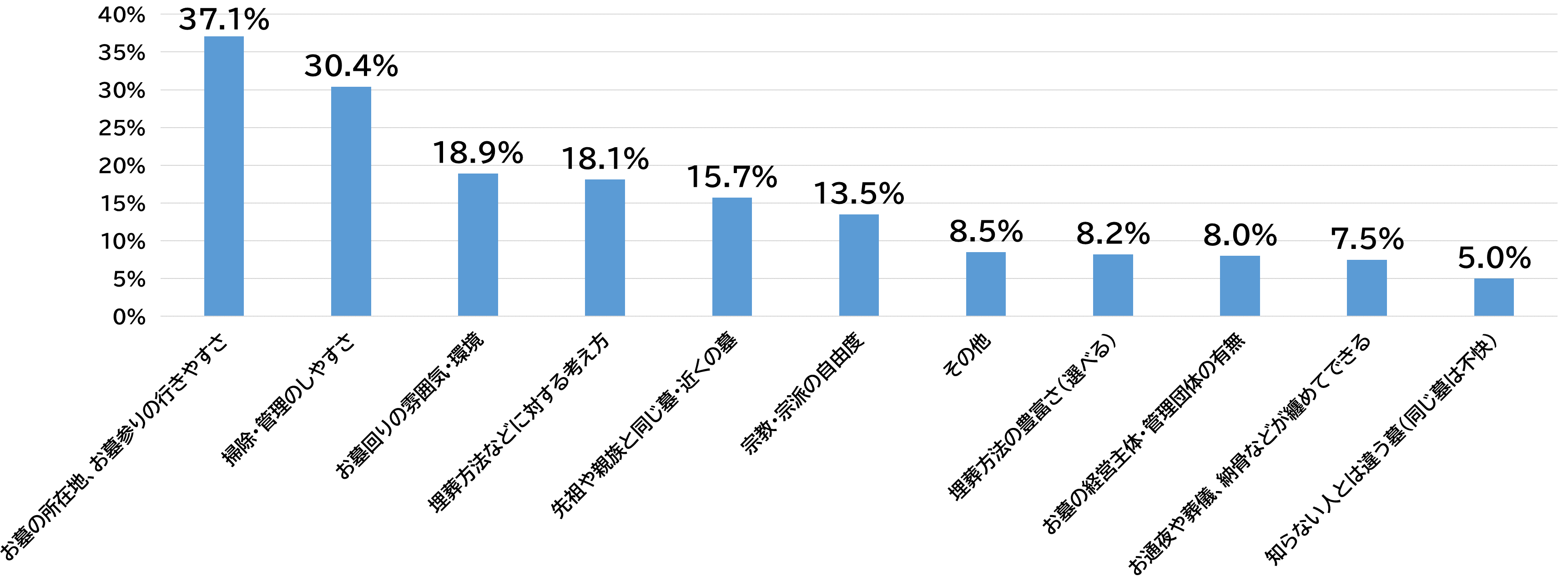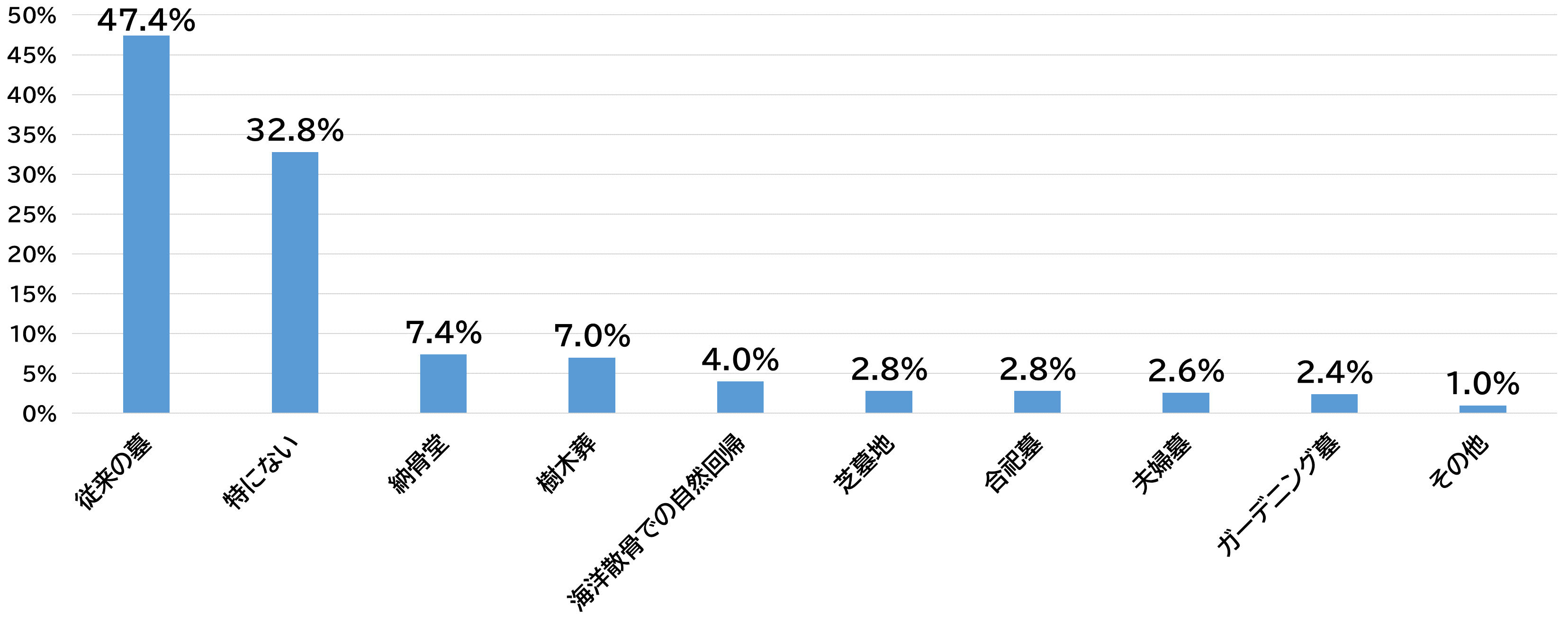 「樹木葬」など近年注目されているお墓のカタチが人気を集める一方で、「納骨堂」や「合祀墓」が新たな供養のカタチが世の中に浸透している結果となりました。