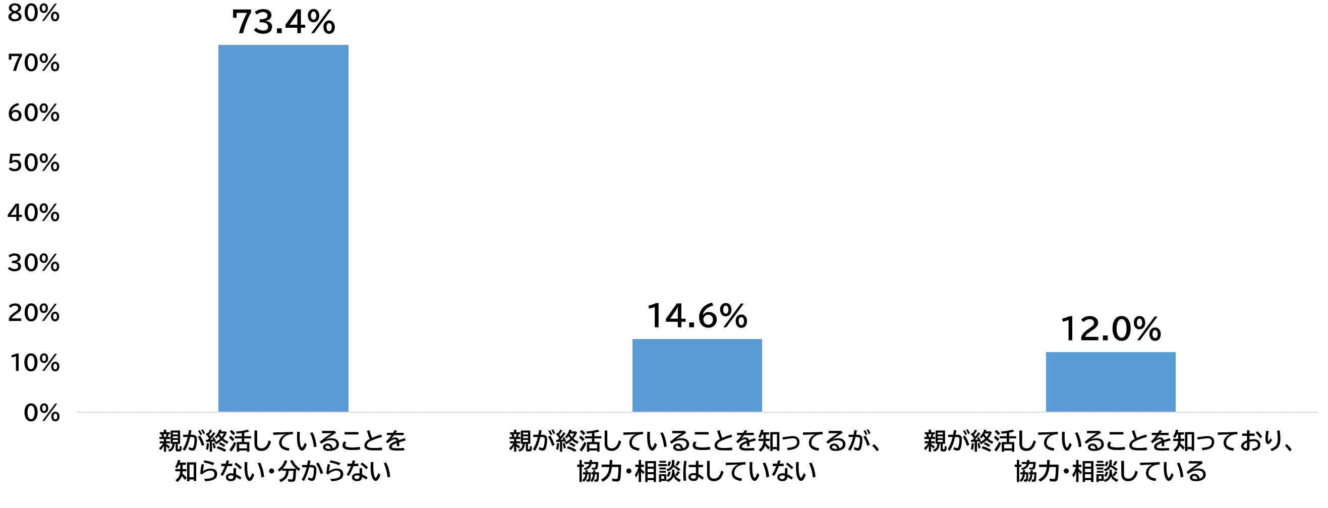 送り出す世代(40代-50代)に両親の終活にどれくらい関与しているか聞いたところ、73.4%の人が、「親が終活していることを知らない・分からない」と回答しました。