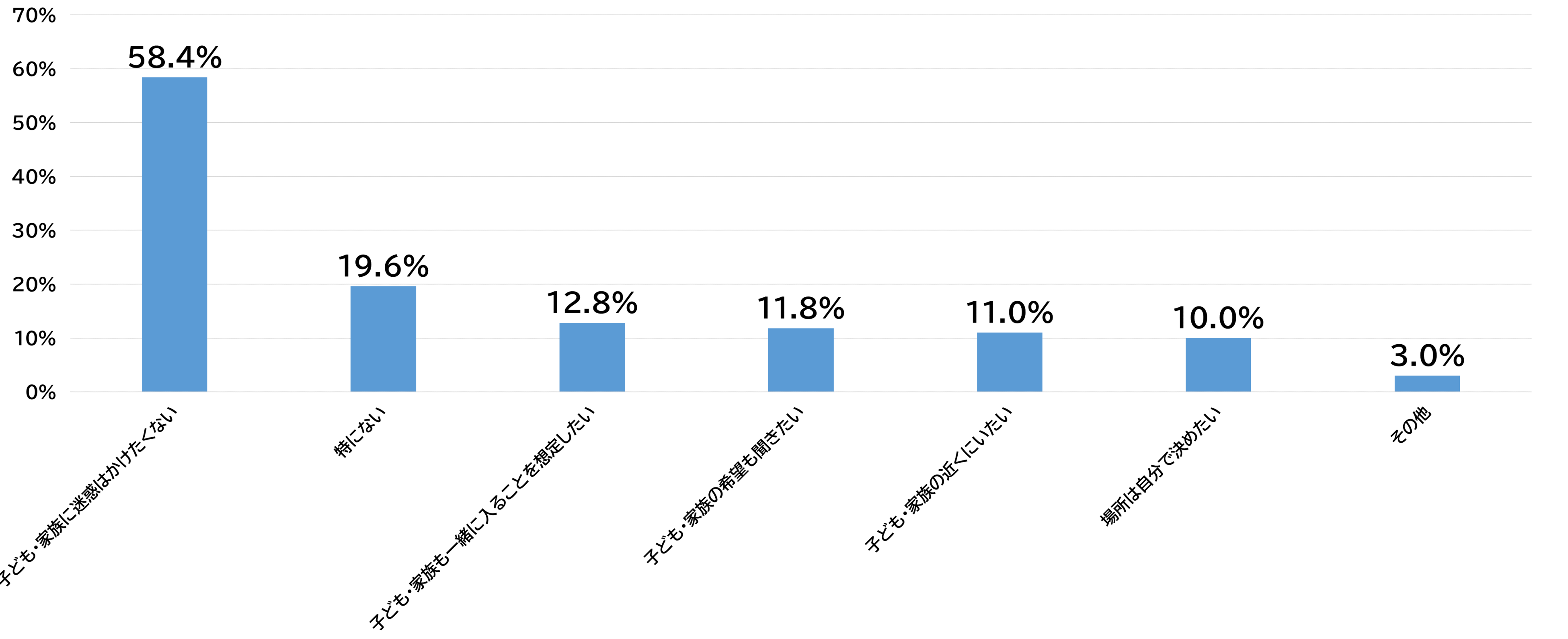 親世代に自身のお墓の場所を選ぶうえで、どのようなことを意識されているかを聞いたところ、「子ども・家族に迷惑はかけたくない」が58.4%で突出した結果となりました。また「特にない」と回答した人を除くと終活とお墓参りどちらのデータを見ても、親世代は子どもや家族に迷惑を掛けたくないという意識を強く持っていることがわかりました。