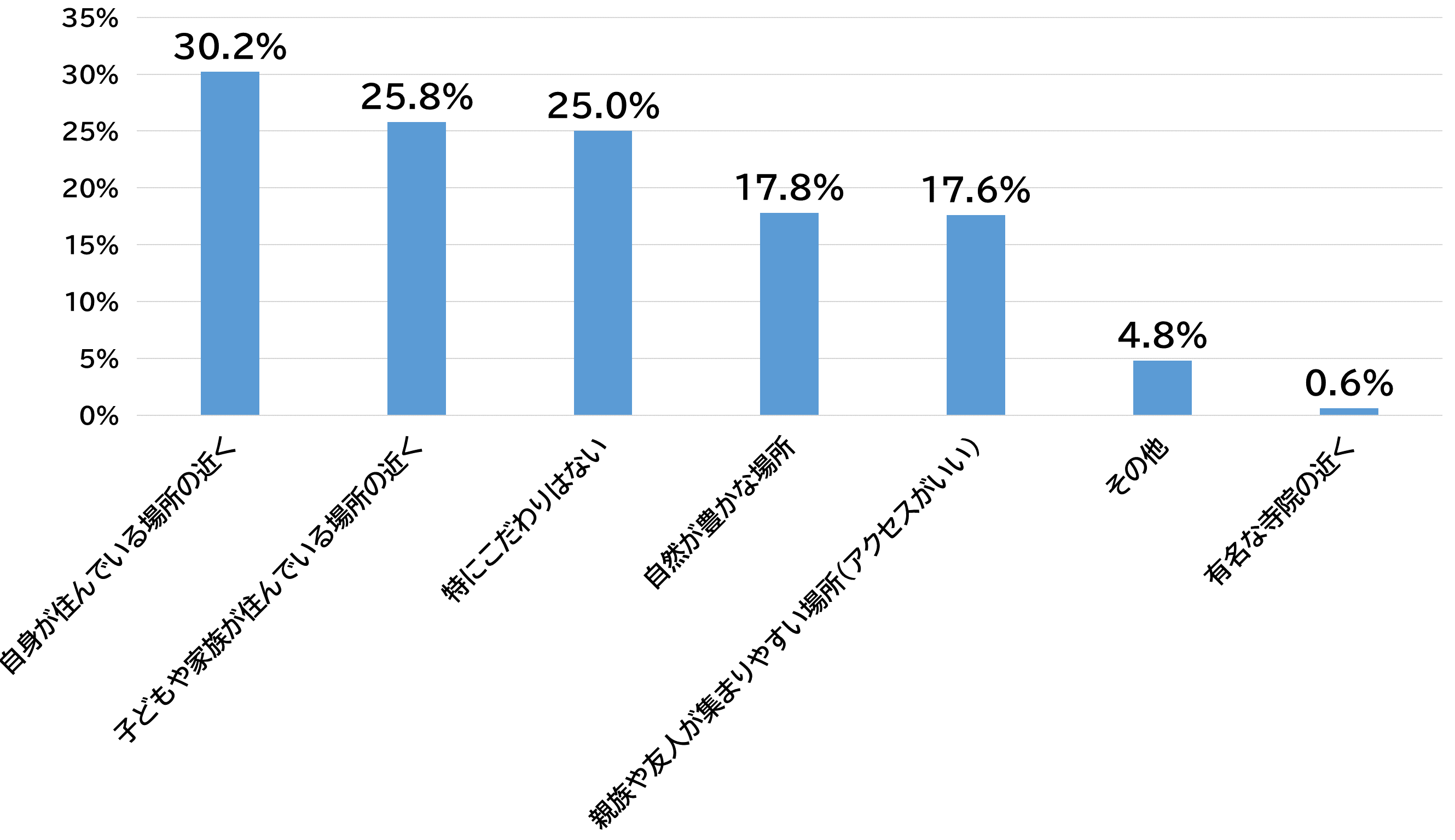 親世代に、自身のお墓がどのような場所にあるといいかを聞いたところ、「自身が住んでいる場所の近く」が30.2%で1位、「子どもや家族が住んでいる場所の近く」が25.8%で2位という結果となりました。