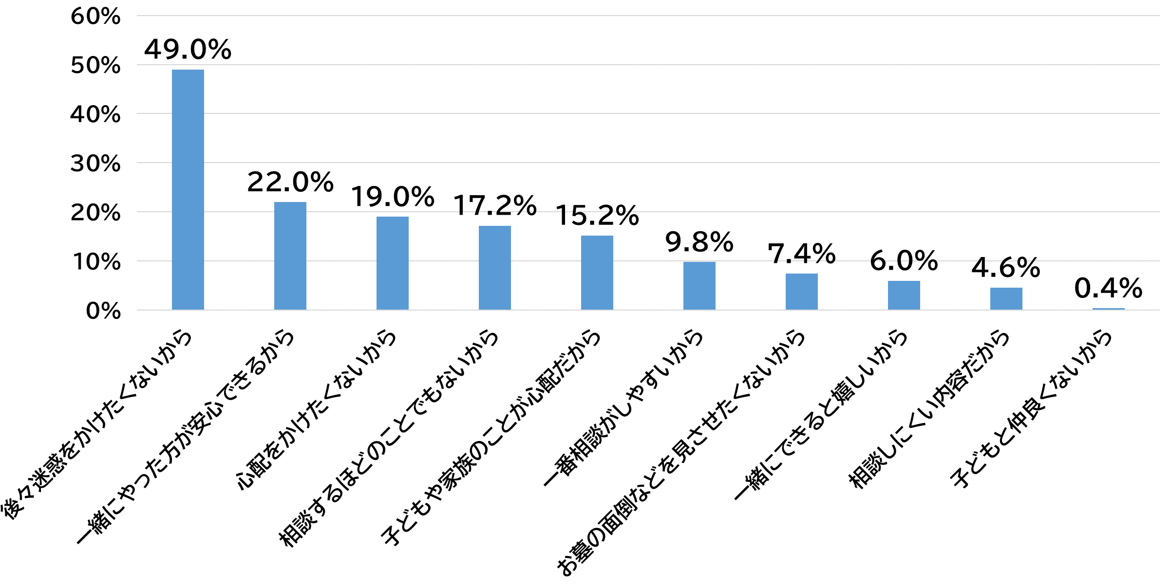 親世代にQ2の回答理由を聞いたところ、相談しながらやりたい理由としては、「後々迷惑をかけたくないから」が49.0%でトップ、「一緒にやった方が安心できるから」が22.0%で2位という結果になりました。また、相談しながらやりたくない理由は、「心配をかけたくないから」が19.0%でトップになりました。どの選択肢を選んだ人も、親として子供の事を考えているということが分かる結果となりました。