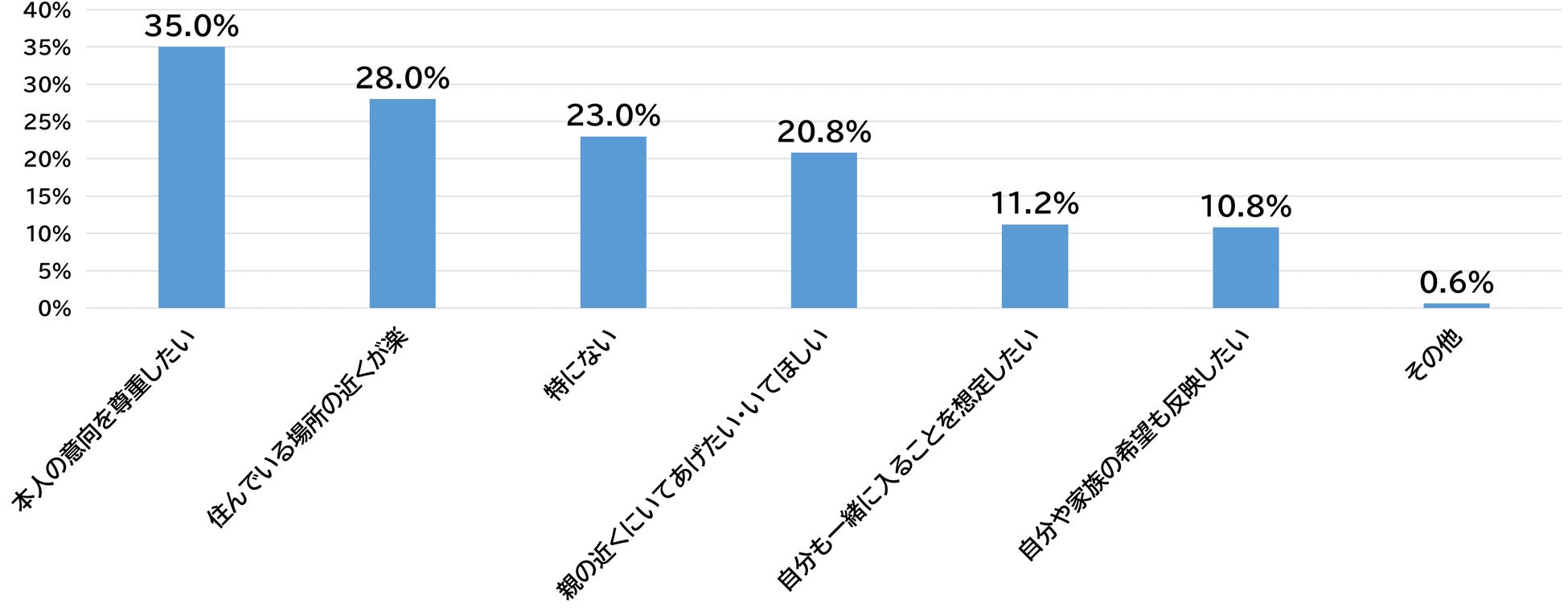 送り出す世代に、ご両親のお墓の場所について聞いたところ、「本人の意向を尊重したい」が35.0%で1位、「住んでいる場所の近くが楽」が28.0%で2位、「特にない(3位/23.0%)」に続いて「親の近くにいてあげたい・いてほしい」が20.8%で4位でした。ご両親の気持ちを尊重し、親には近くいてほしいと思う一方で、アクセス面での利便性も重要であるという意向が読み取れました。