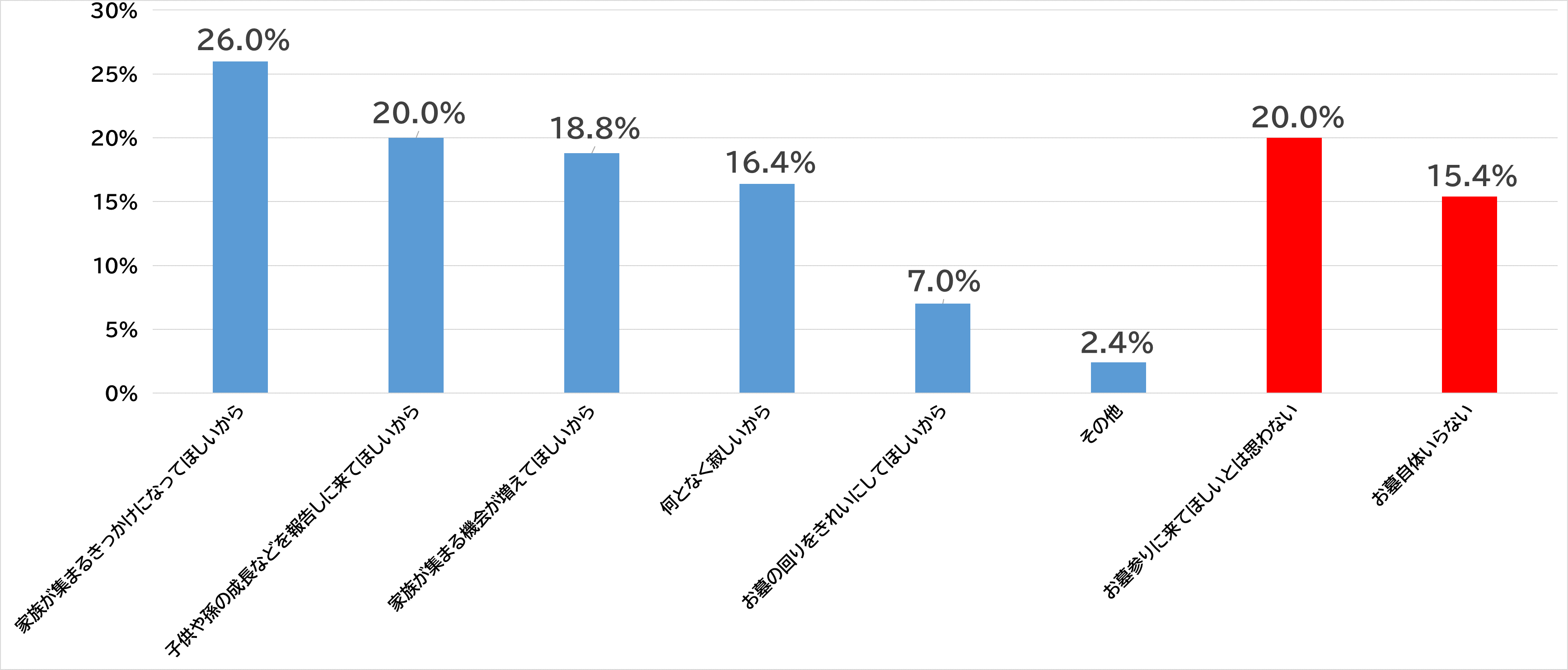 葬儀は小規模に済ませることが多くなる一方で、お墓参りは家族の結びつきの為に大事であると考えている人が多いことが分かりました。「お墓参りに来てほしいとは思わない」という理由も、子供への配慮であることも推測できます。