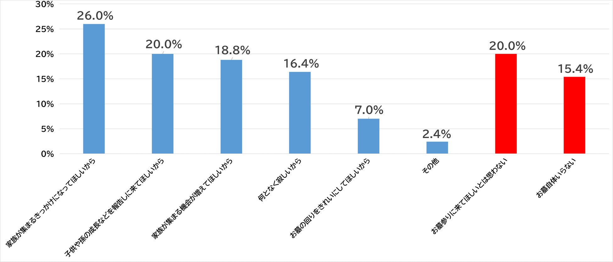 親世代に、ご自身が無くなられた際にお墓参りに来て欲しいか、またその理由を聞いたところ、「家族が集まるきっかけになってほしいから」が26.0%で1位、「子供や孫の成長などを報告しに来てほしいから」と「お墓参りに来てほしいとは思わない」が20.0%で同率2位、「家族が集まる機会が増えてほしいから」が、18.8%で4位という結果となりました。
