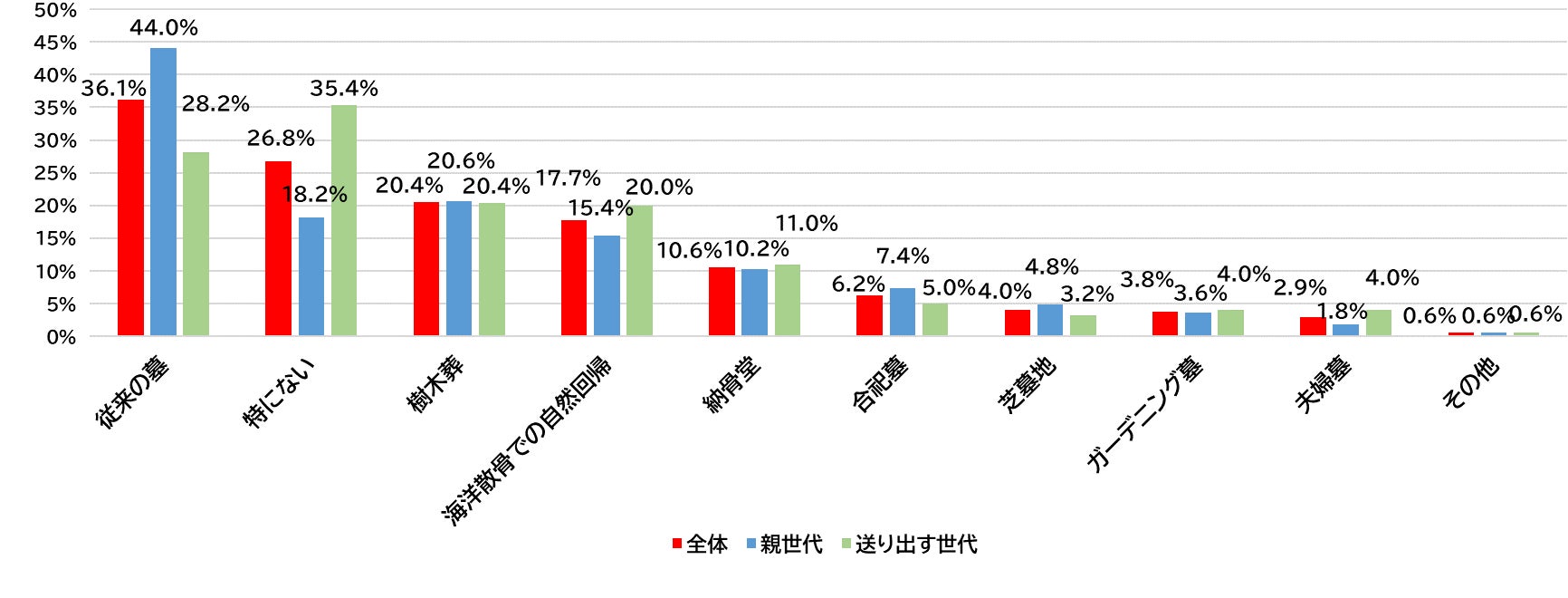 両世代に、興味のあるお墓・供養方法の種類を聞いたところ、「特にない」と回答した人を除くと「従来の墓」が36.1%で1位、「樹木葬」が20.4%で2位、「海洋散骨での自然回帰」が17.7%、「納骨堂」が10.6%、「合祀墓」が6.2%で続く結果となりました。また、「従来の墓」を選んだ人は、親世代で44.0%、送り出す世代で28.2%と世代間での差が出ました。