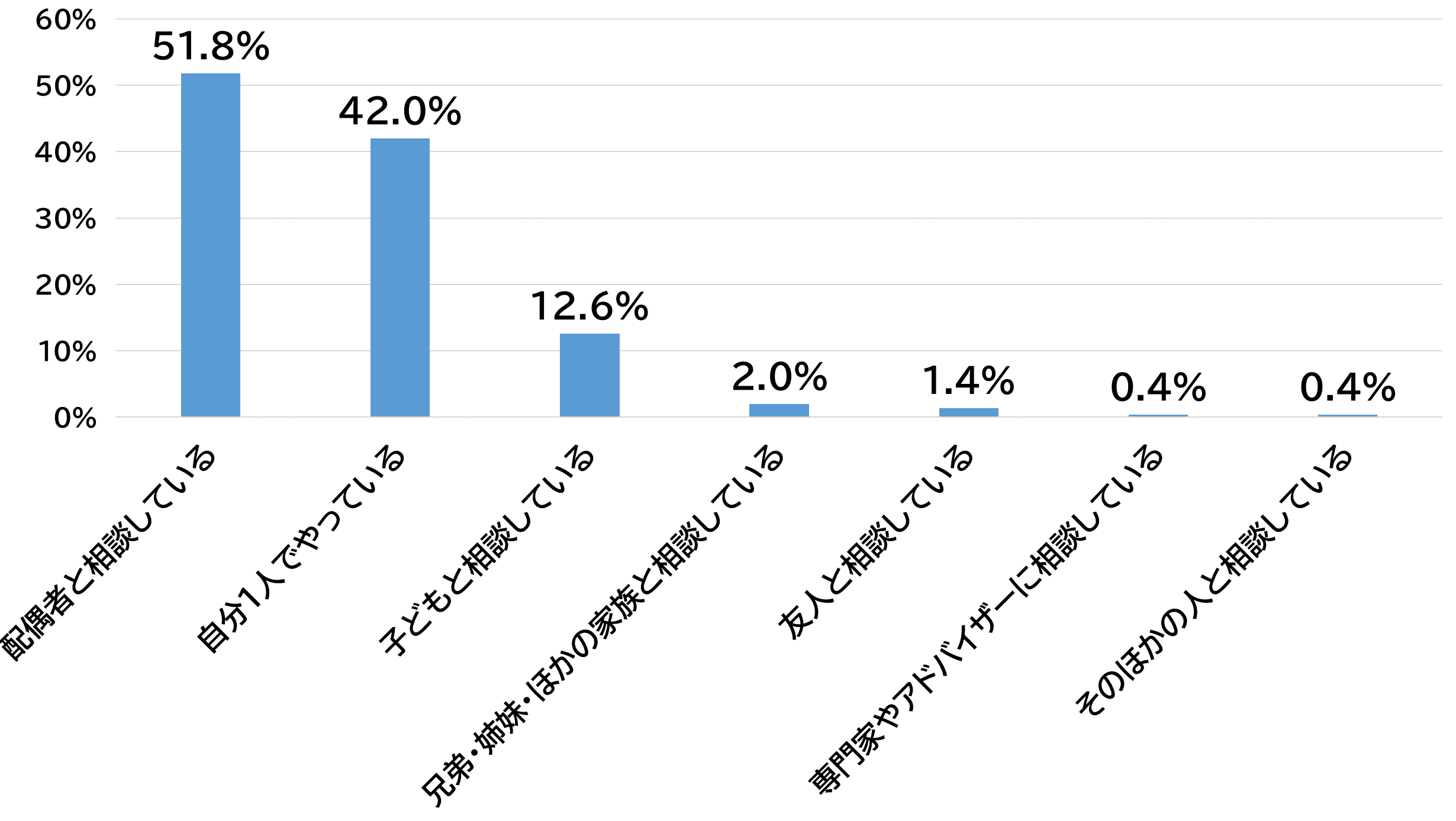 親世代に、どなたかと相談しながら終活をしているかを聞いたところ、「配偶者と相談している」と回答した人が、51.8%でトップとなりました。次に「自分1人でやっている」が42.0%で2位、「子どもと相談している」と回答した人は、12.6%で3位となりました。配偶者に比べて、子供には終活を相談をしていないという現状が明らかになりました。