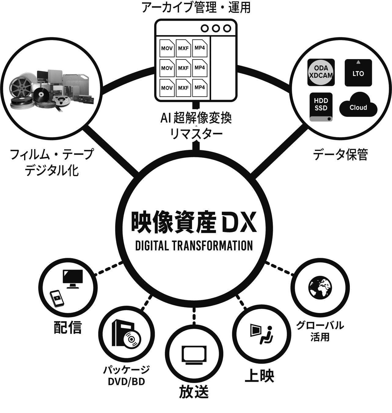 株式会社エクサインターナショナルは、ポストプロダクション(編集・MA・テレシネ・DCP)事業を中心に、映像コンテンツ企画制作、3Dバーチャルスタジオ運営、ライブ動画配信などを行う総合映像サービス事業会社です。近年特に、VTRのメーカーサポート終了に伴いフィルム/テープで保管されている映像素材のデジタル化が喫緊の課題となっている背景もあり、映像資産のファイル化/アーカイブ化による利活用促進と保管コスト圧縮を実現する「映像資産DXサービス」に多くのご発注をいただいております。