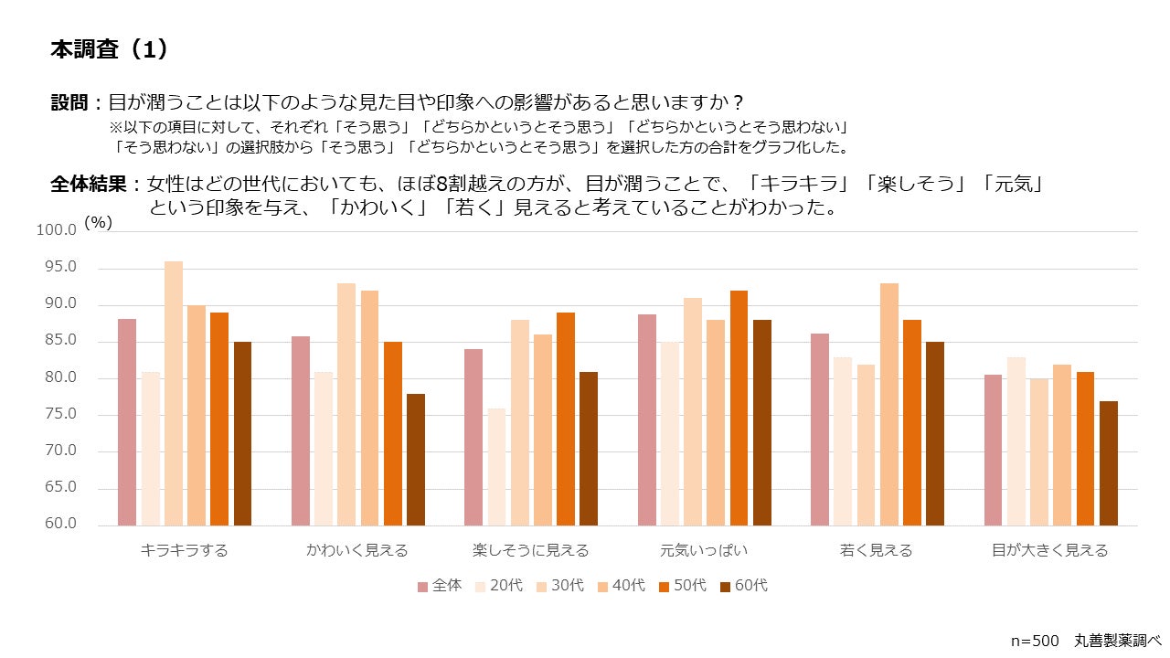植物を中心とする天然物より、食品、化粧品、医薬品や医薬部外品の原料を製造する丸善製薬株式会社(所在地:広島県尾道市、代表取締役社長:日暮 泰広)は、目の潤いの有無が見た目に与える影響について、20代から60代の女性を対象にインターネットアンケート調査を実施しました。