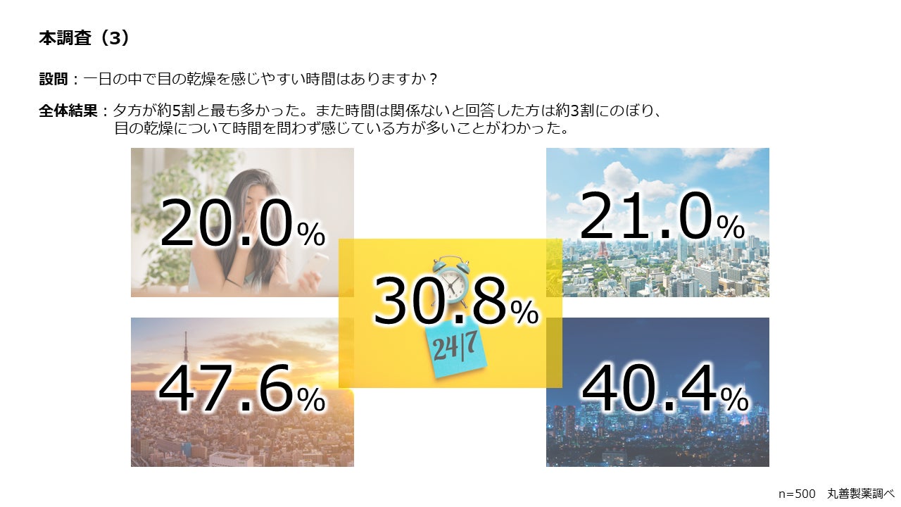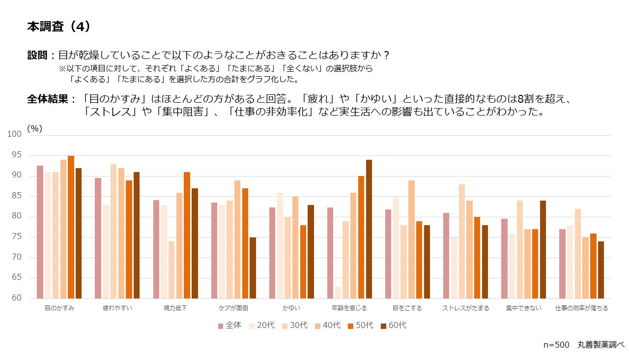 この調査により20代から60代の女性の5人に2人が目の乾燥を感じていること、約8割が目の潤いが見た目に影響すると考えていることがわかりました。また目に乾燥を感じている女性の8割以上が目が潤うことで「かわいく」「若く」見えると考えていることが確認されました。さらに約3割から4割が季節や時間を問わず目の乾燥を感じていること、目の乾燥が「かゆみ」や「疲れ」といった直接的な症状だけでなく、「ストレス」や「集中阻害」といった実生活へも影響を及ぼしていることがわかりました。