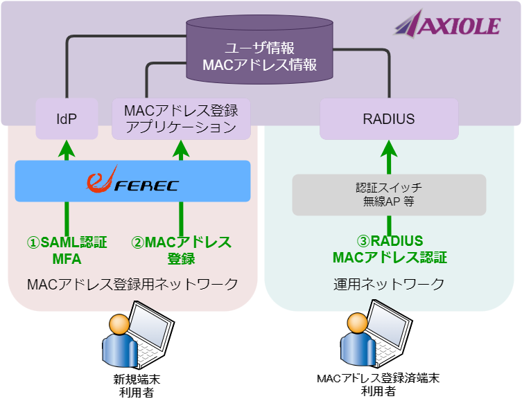 MACアドレス登録アプリケーションは eFEREC(*1)と連携し、認証したユーザの利用端末の MACアドレスを自動的に取得、ユーザはそのMACアドレスを AXIOLEの MACアドレスエントリに登録追加することができます。追加した MACアドレスエントリは、RADIUS MACアドレス認証に利用することができます。