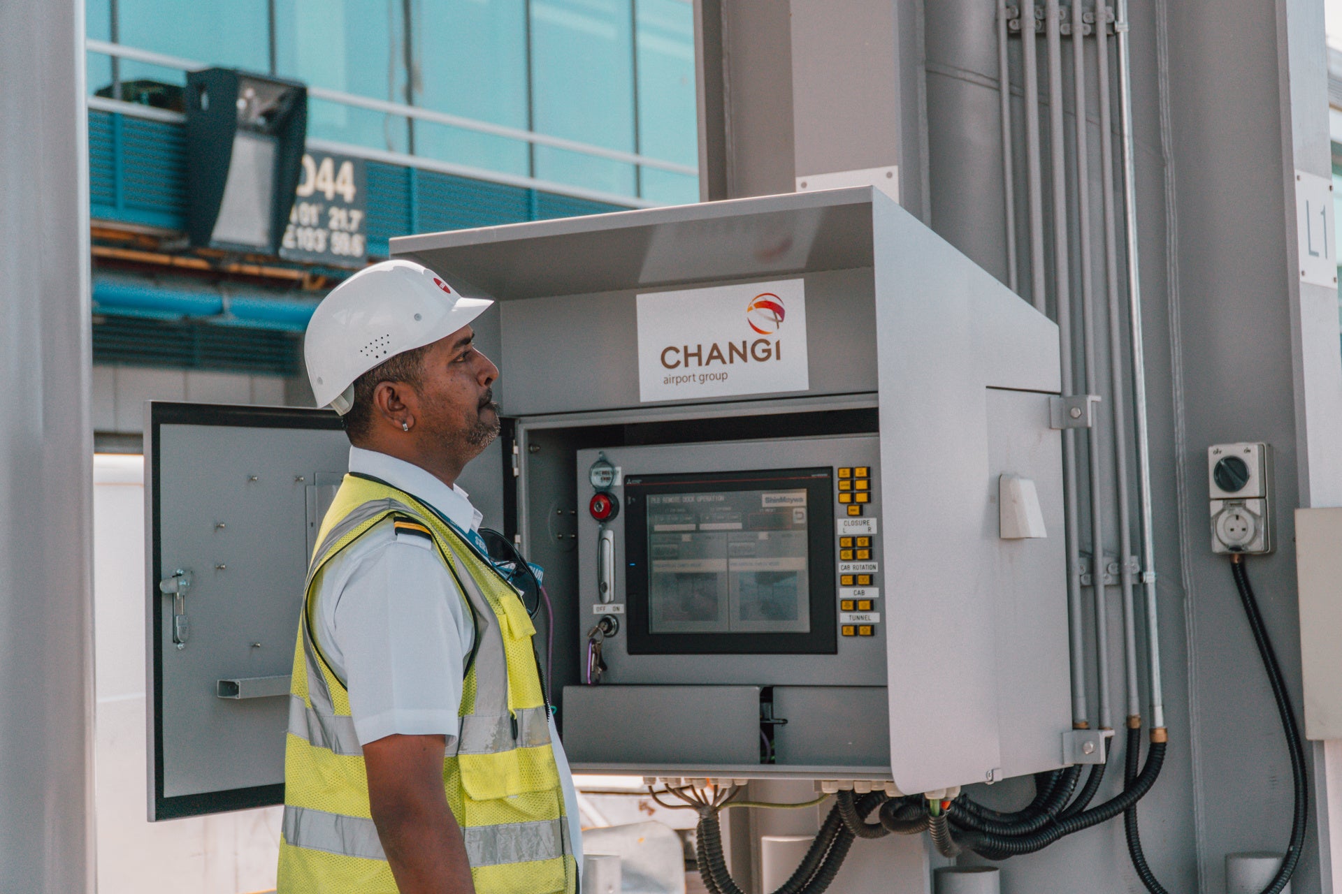 チャンギ空港に設置した航空旅客搭乗橋「フルオート・ドッキングシステム」遠隔操作盤(画像提供:チャンギ・エアポート・グループ殿)