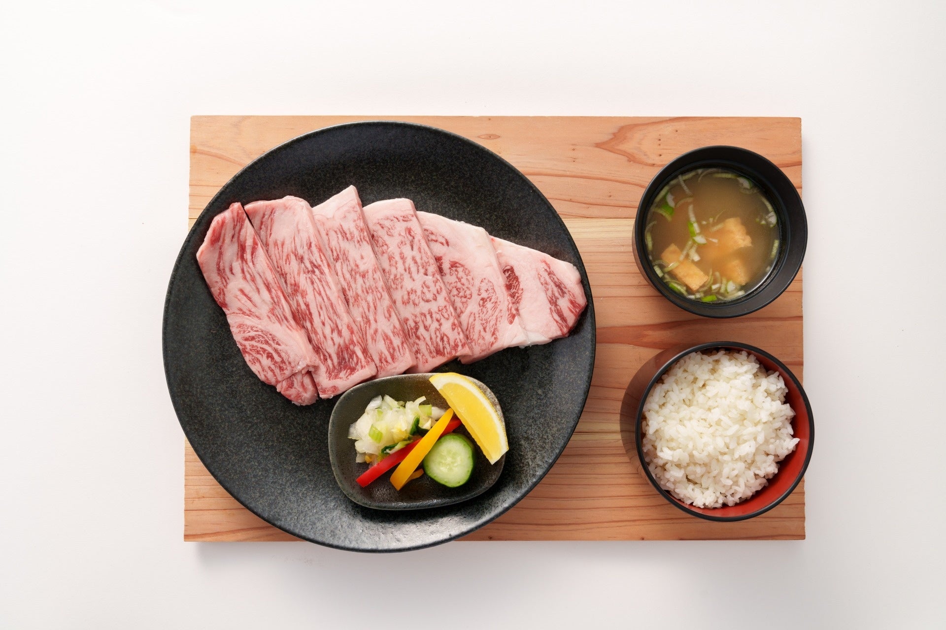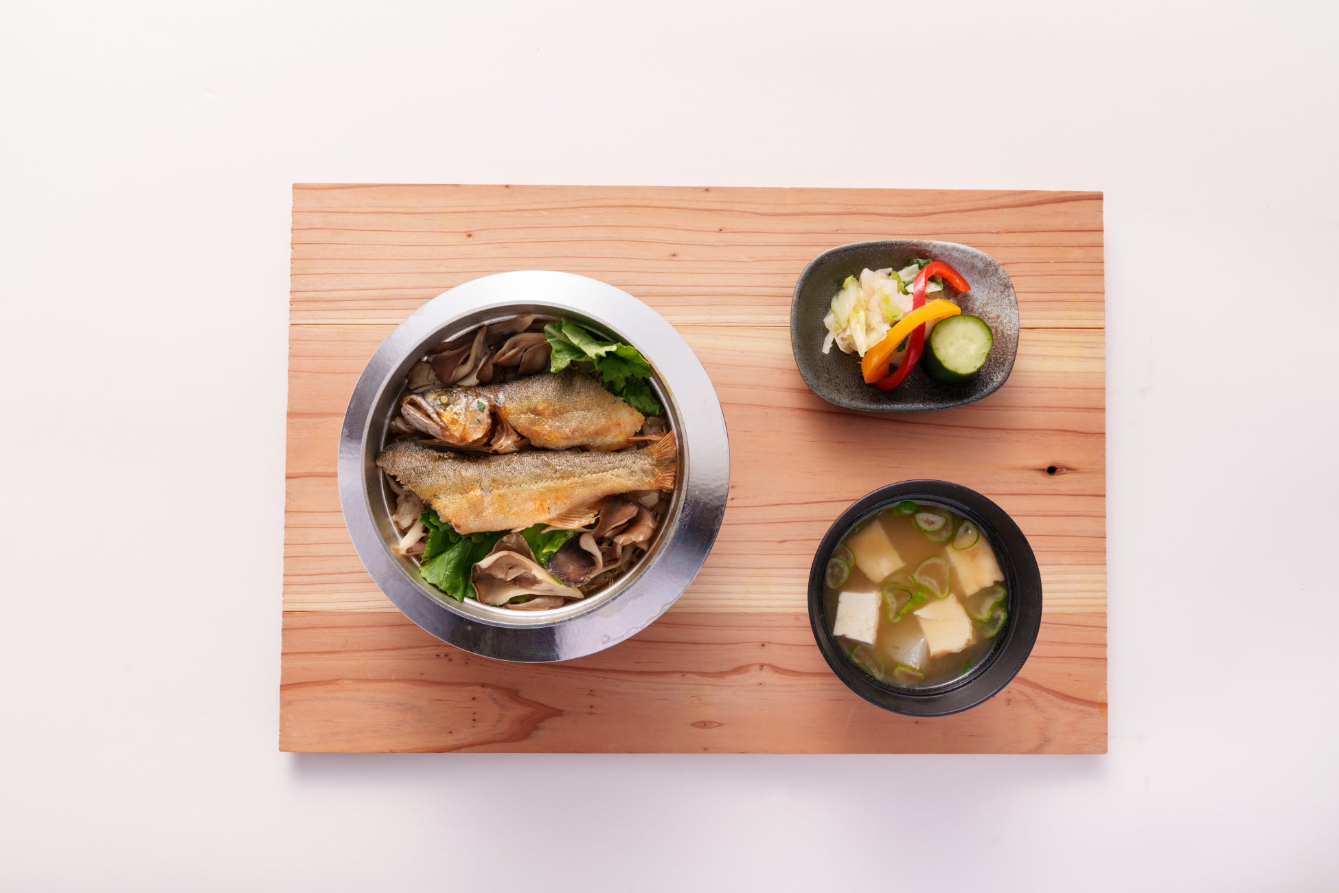 秋川牛サーロイン肉を溶岩プレートで炙るステーキ、鮎の釜飯、タレカツ丼やハンバーグなど。