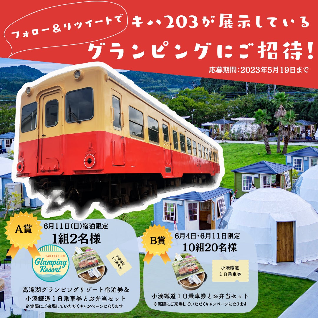 キハ203の到着と公開を記念して高滝湖グランピングリゾート公式twitterアカウントにて公開記念キャンペーンを実施いたします。