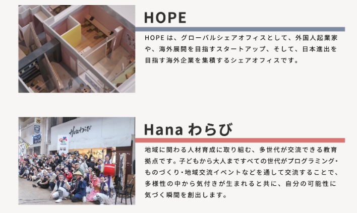 挑戦する人を支援する、商店街一体のオープンイノベーション拠点です。起業支援施設やシェアオフィス、県外企業のサテライトオフィスといったビジネスの場に加え、エンジニア向けのシェアハウスやワーケーション向けホテル、コーヒー専門店や個性的で多分野の人が集まるソーシャルバーなどの交流の場で構成されます。一時はシャッター商店街となっていたエリアにチャレンジ精神旺盛で、新しいアイデアを持った人材が集まり、活気が戻っています。