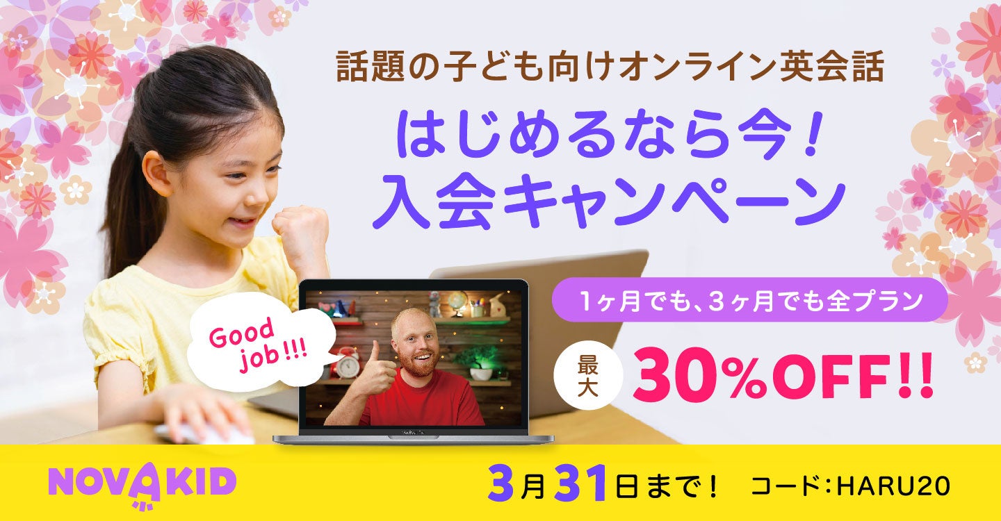 子ども向けオンライン英会話サービスを提供するEdTech企業、Novakid(本社、米国サンフランシスコ、以下、ノバキッド)は、3月25日(金)から3月31日(木)までの7日間、新規入会の方に限りノバキッドが提供する全プランを20〜30%OFFでご利用いただける「春の入会キャンペーン」を初開催します。