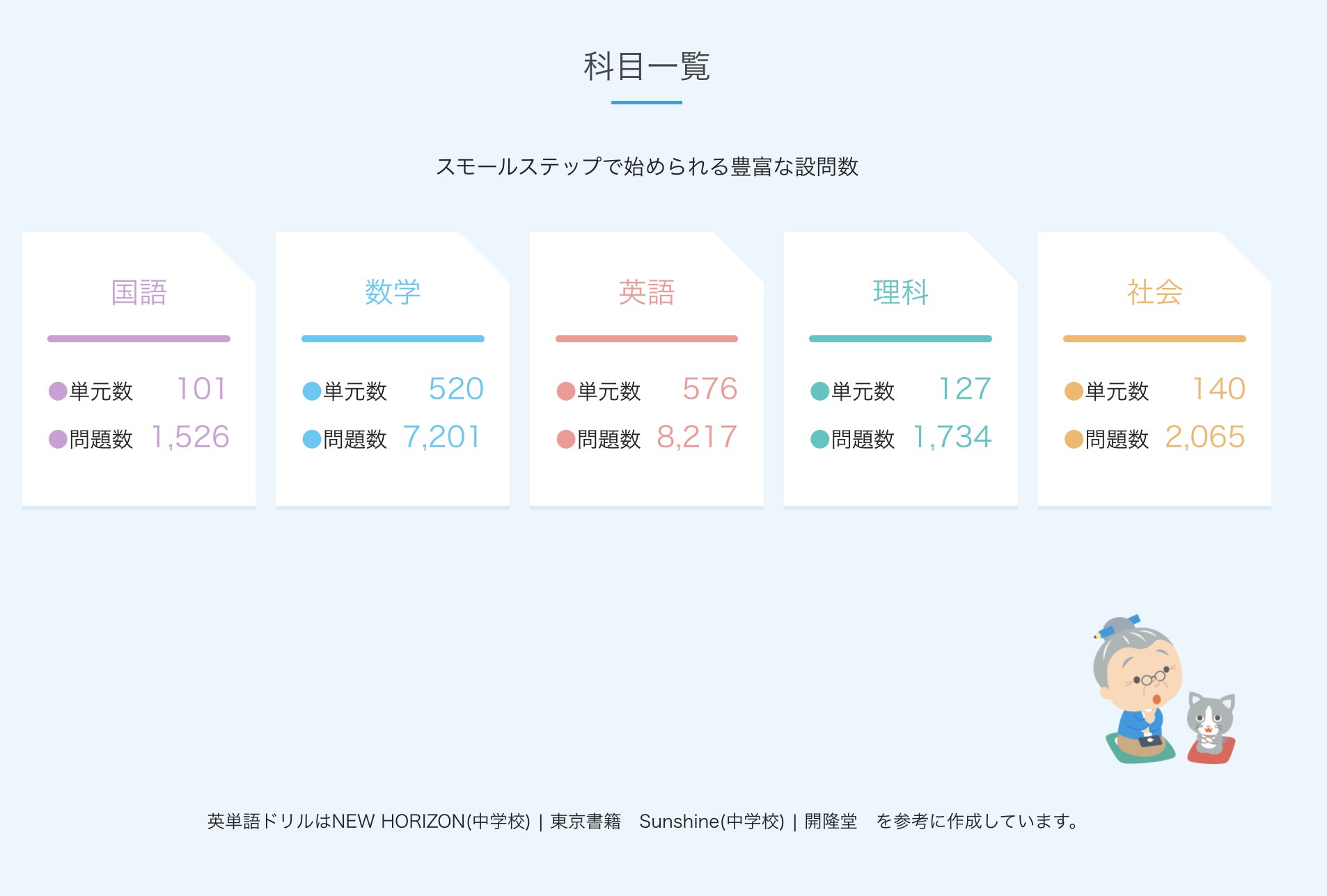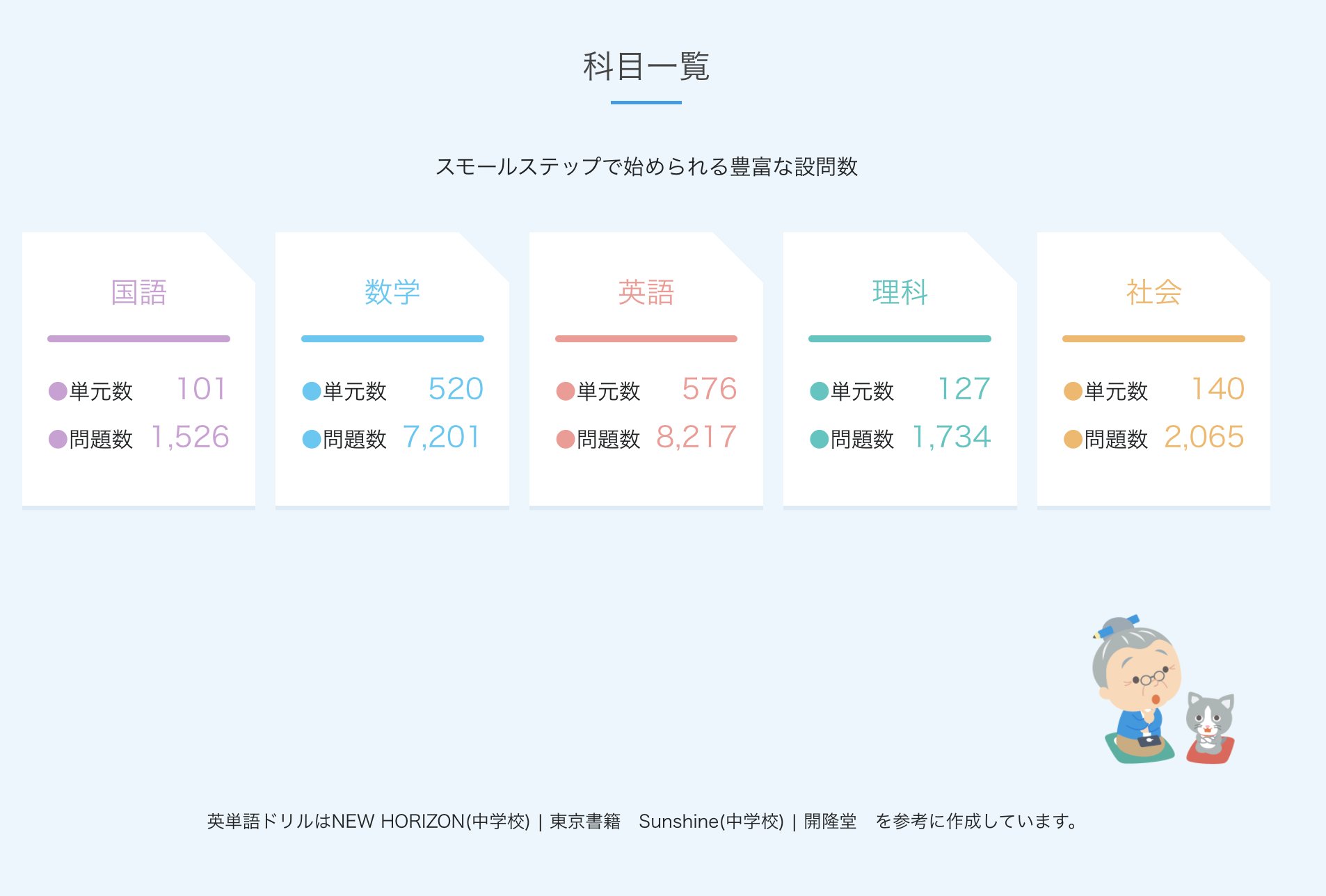 現在は数学、英語(英文法、英単語)、国語知識、社会、理科と科目が増えてより使いやすくなりました。
