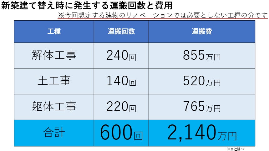 その結果リノベーションであれば、運搬回数は600回減らすことができ、運搬費用だけでもおよそ2,000万円削減できることが分かりました。(※自社調べ)