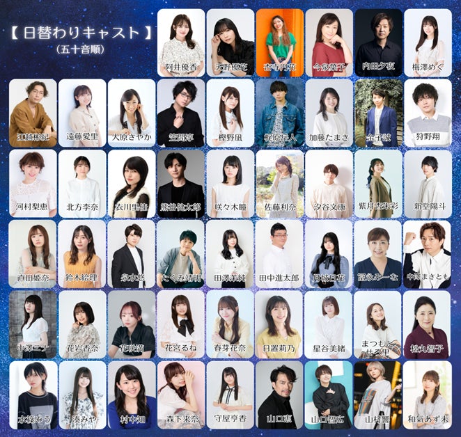 その作品に、冨永みーな(『サザエさん』磯野カツオ役、『それいけ!アンパンマン』ドキンちゃん役、ロールパンナ 役ほか)、内田夕夜(『タイタニック』ジャック役[レオナルド・ディカプリオ]、『わたしの幸せな結婚』甘水直 役ほか) 、梶原岳人(『ブラッククローバー』アスタ役、『炎炎ノ消防隊』森羅日下部 役ほか)、和氣あず未(『アイドルマスター シンデレラガールズ』片桐早苗 役、『ウマ娘 プリティダービー』スペシャルウィーク役ほか)ほかのベテランから若手まで、魅力的な俳協オールスターキャスト51人が日替わりで登場し、脚本・演出を務める岩尾万太郎とともに新たな物語を紡ぐ。