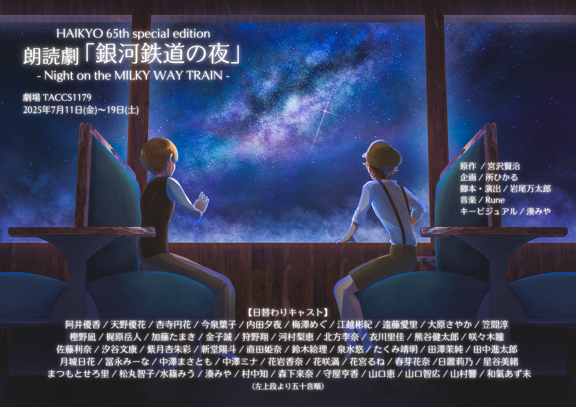 声優プロダクションのパイオニア「俳協」が創立65周年を記念して、所属声優51名が出演する朗読劇「銀河鉄道の夜」- Night on the MILKY WAY TRAIN -を2025年7月11日(金)から19日(土)まで、東京・新宿区「劇場TACCS1179」にて全12公演行うが、そのキャスト51名が発表された。