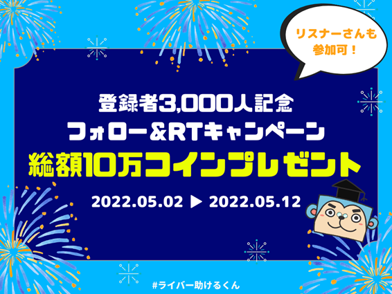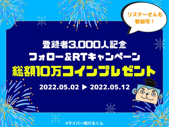 『ライバー助けるくん』がサービス開始1ヶ月でユーザー登録者3,000人突破総額10万コインプレゼントキャンペーン実施