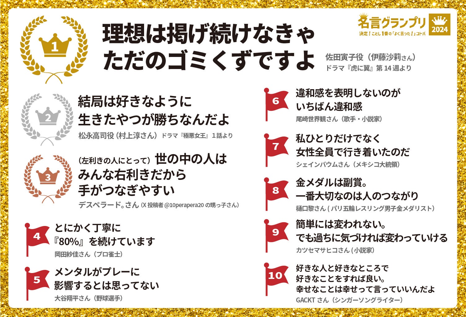 TV・SNS・雑誌などから年間300以上の名言を集める伝え方研究所※は「名言グランプリ2024」を開催しました。2017年以来、第8回目となる今年は、ジャーナリストの田原総一朗さんら計7名の審査を経て、「最も素晴らしかった名言No.1」を「理想は掲げ続けなきゃただのゴミくずですよ」に決定しました。朝ドラ『虎に翼』で、日本初の女性弁護士、後に裁判官となった主人公・寅子の言葉です。このほか、ベスト10の結果を伝え方研究所の公式webサイトなどで公表中です。