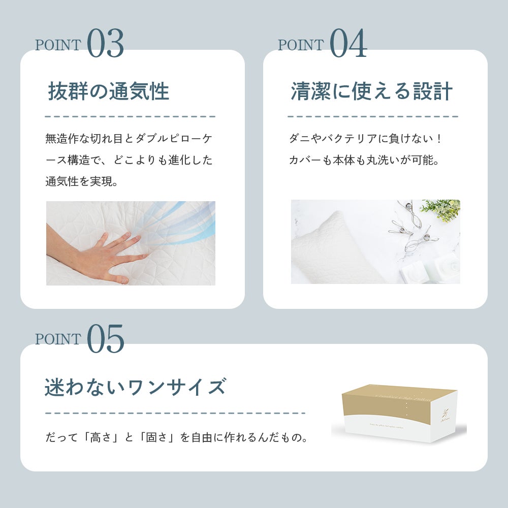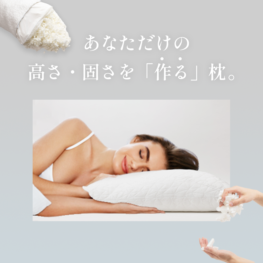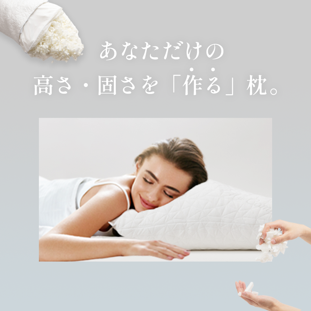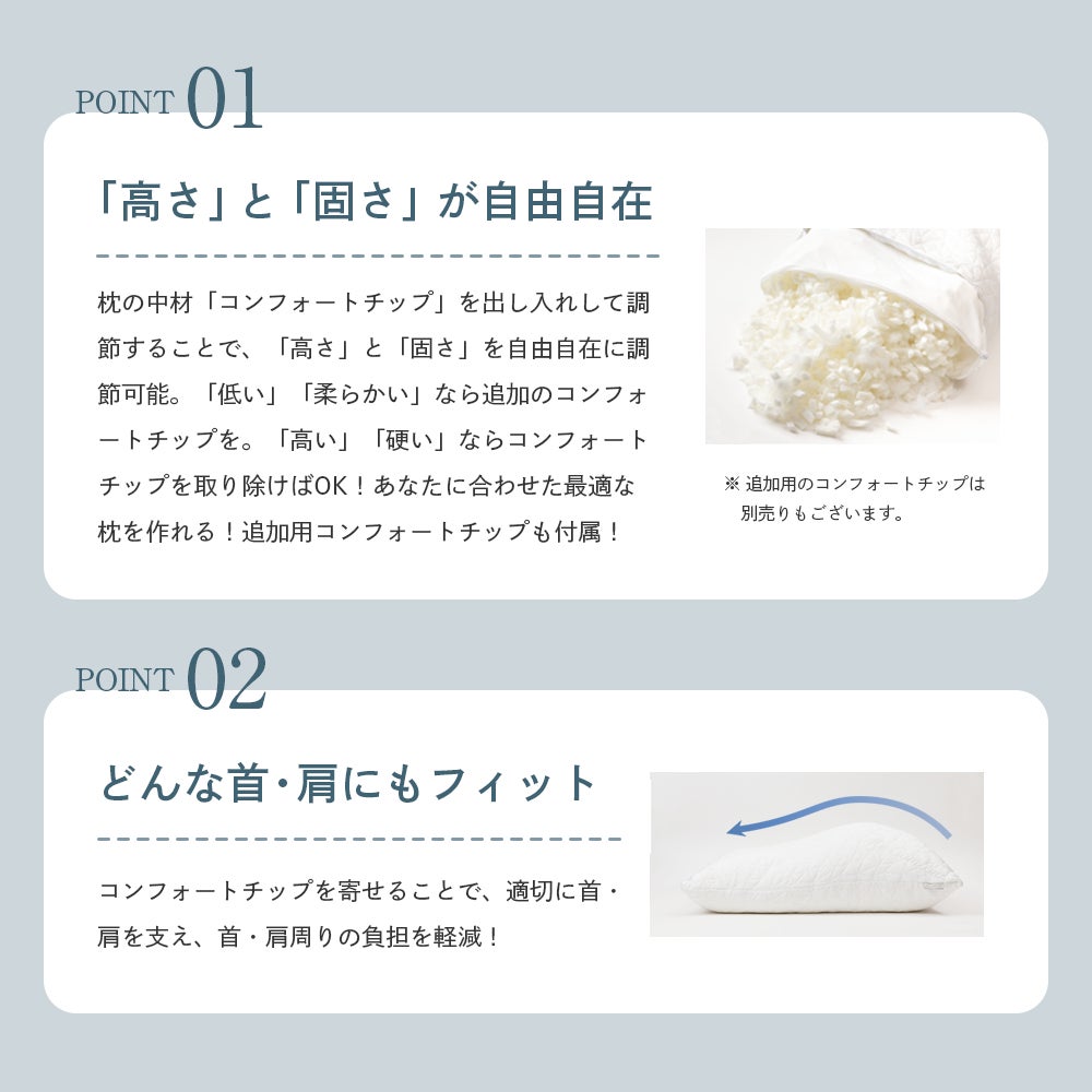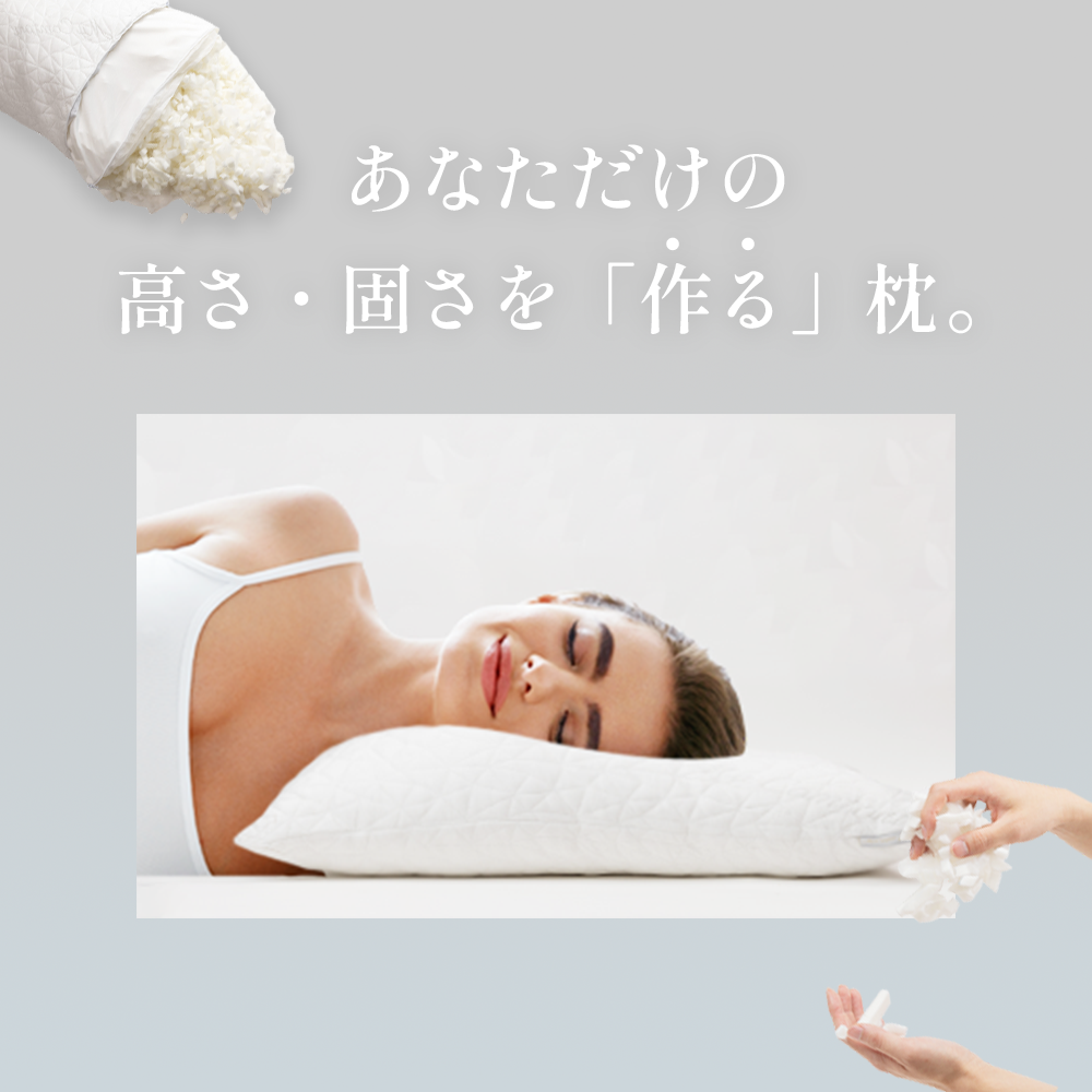 今回のコンフォートチップピローは中材である 「コンフォートチップ」を出し入れすることで、高さと固さを整える事ができ、自由自在に自分好みの枕を作り出すことができるのだ。
