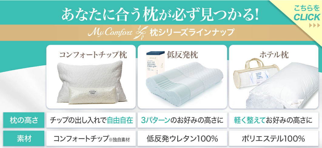 MyComfortではコンフォートチップピローの他に3パターンのお好みの高さに調節できる低反発枕、最高級ホテル式のふかふかさを実現したホテル式まくらも取り揃えている。