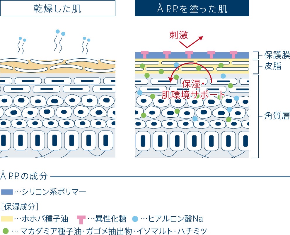 撥水性のシリコンポリマー※により保護膜を作り、肌の蒸散量を抑え、水をはじいて、外的刺激から、しっかり肌を守ります。