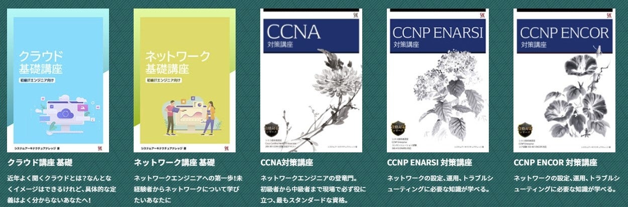 BOOKNSは、昨今多くの企業で資格取得が推奨されているITパスポートから、ネットワークの上級者向け資格であるCCNPまで、幅広い層のニーズに対応できるよう豊富なラインナップを取り揃えています。また、社会人の基礎となる各種研修リファレンスにも対応しております。