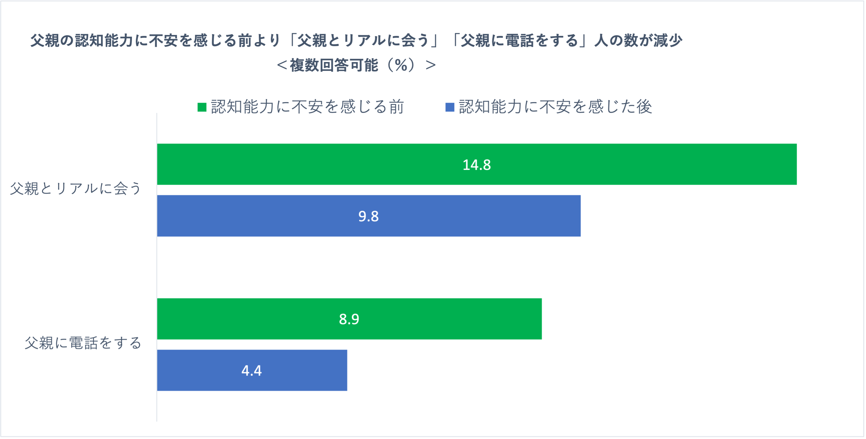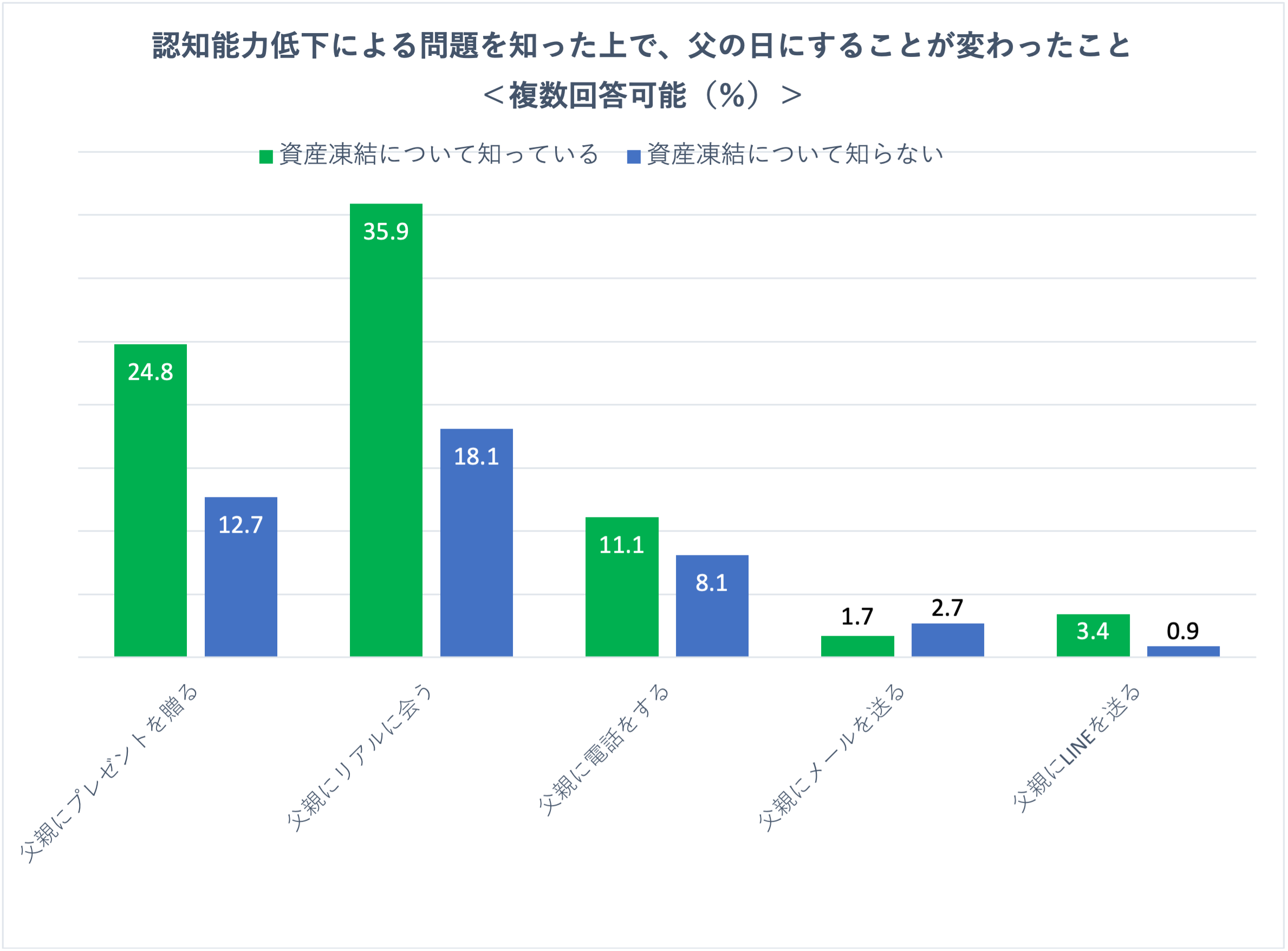 | ・判断能力(意思能力)が無くなると資産凍結される可能性があることを知っている人は34.6% ・認知能力低下による資産凍結の対策を知らない人は46.2% ・判断能力(意思能力)が無くなると資産凍結されることを知っている人は、知らない人に比べて親の認知能力低下に対する対策を行っていることが多い ・父親について、認知能力の低下に気づくきっかけでもっとも多いのは、帰省時の日常動作で45.7% ・別居している父親の認知能力について何らかの心配があると認識している方は、していない方に比べ、リアルに会ったり、電話をする人が多い ・認知能力に不安を感じているものの資産凍結リスクを把握していない人は61.6%で、既にリスクにさらされている方が多い・・・考察① ・意外なことに、父親の認知能力に不安を感じた後の方が「父親とリアルに会う」「父親に電話をする」人の数が減少・・・考察② |