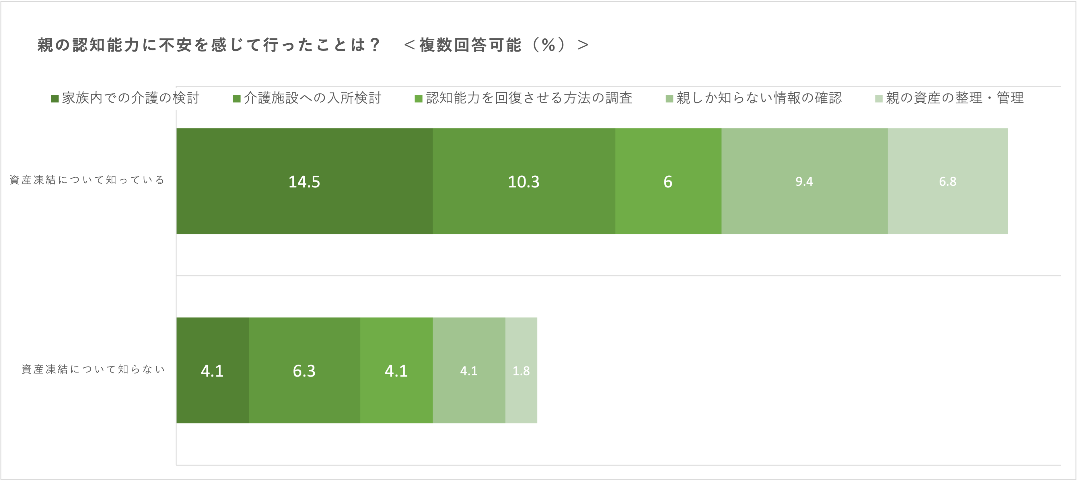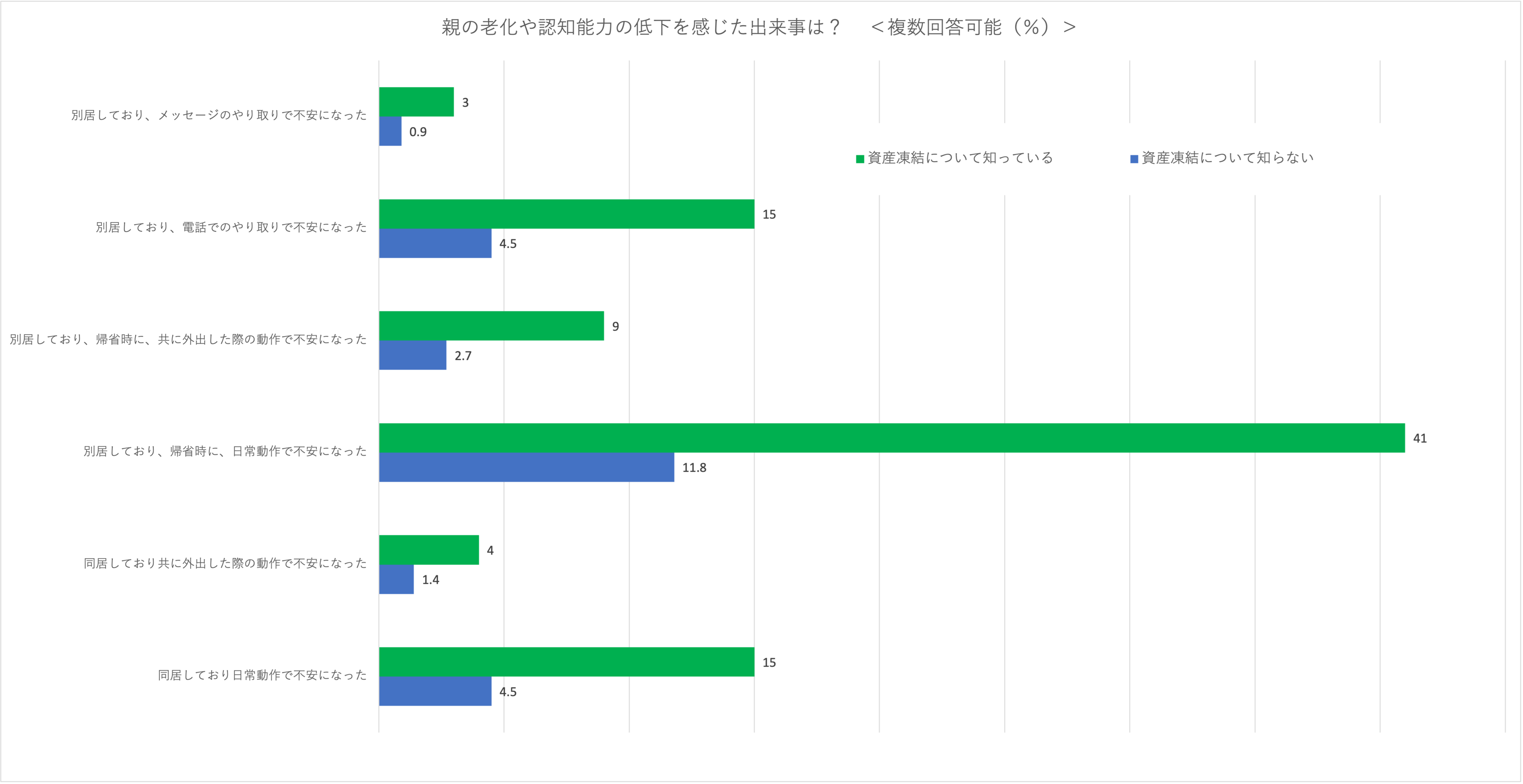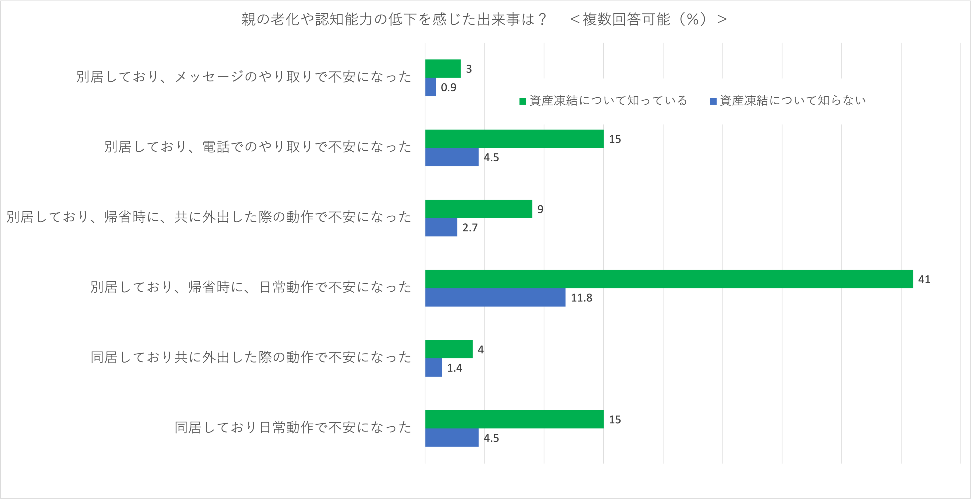 ①認知能力が低下すれば自然と資産凍結の事実を把握できるわけでは当然なく、将来起きる認知能力に関する問題を事前に教えてくれることは稀です。その結果、親の認知能力に不安を感じているにも関わらず、知識がないため対策を未然に行えず、後でトラブルに巻き込まれるリスクを3人に2人程度はらむことがわかり、この問題について知っておくことが重要と考えられます。