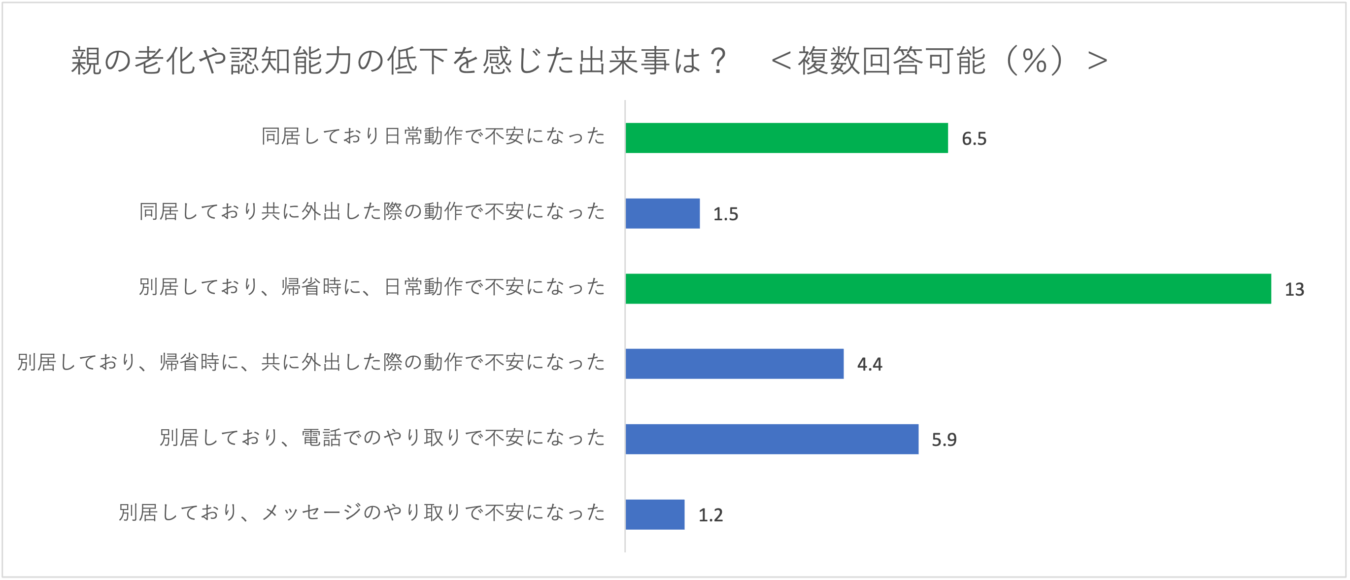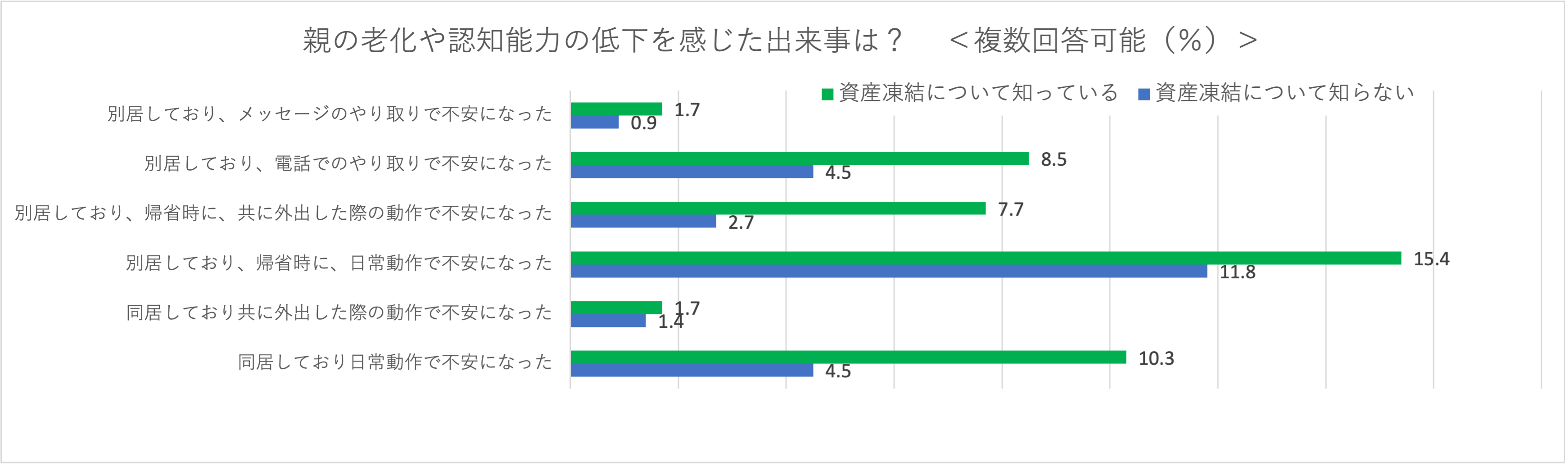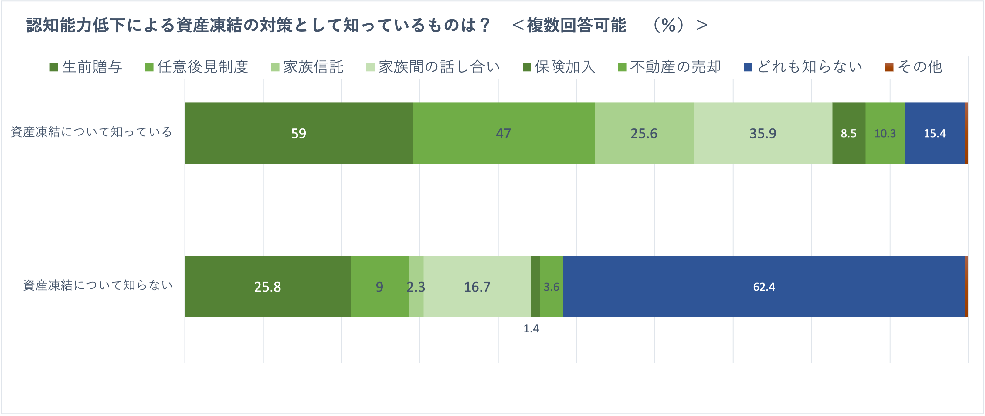 ①認知能力が低下すれば自然と資産凍結の事実を把握できるわけでは当然なく、将来起きる認知能力に関する問題を事前に教えてくれることは稀です。その結果、親の認知能力に不安を感じているにも関わらず、知識がないため対策を未然に行えず、後でトラブルに巻き込まれるリスクを3人に2人程度はらむことがわかり、この問題について知っておくことが重要と考えられます。