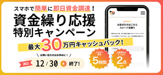 株式会社ビートレーディングでは、2022年11月7日(月)~2022年12月30日(金)までの期間限定で「資金繰り応援特別キャンペーン」を行っております。