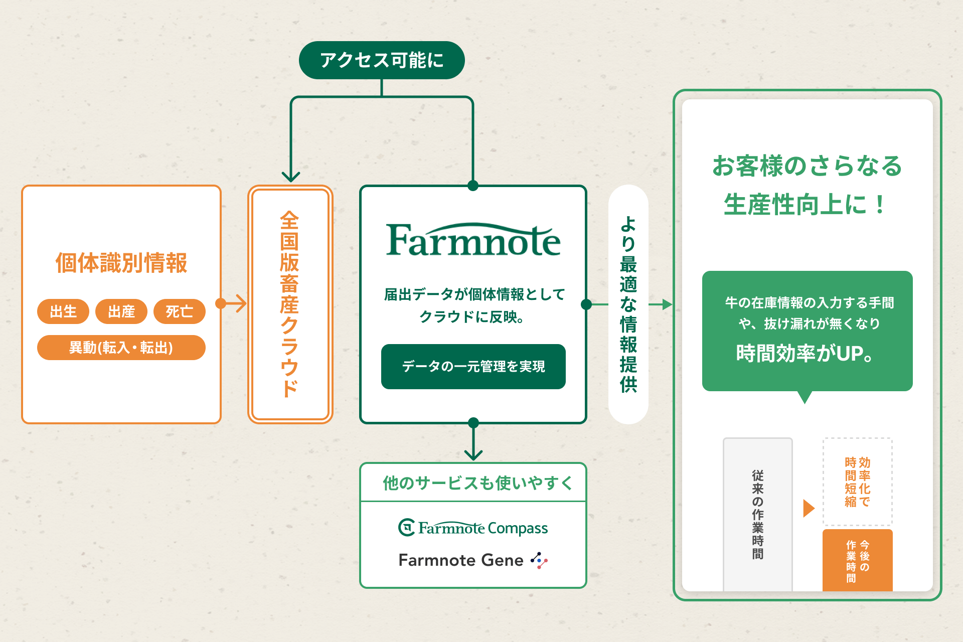 牛個体識別情報を活用する全国版畜産クラウドシステムとFarmnote Cloudが連携することによって、このような作業の煩わしさから開放され、牛の在籍情報や分娩情報など必要な情報を一元的に管理することが可能になります。生産者はいつでもどこでも牛の情報にアクセスできるため、簡単かつ効率的に牛群管理を行うことができます。