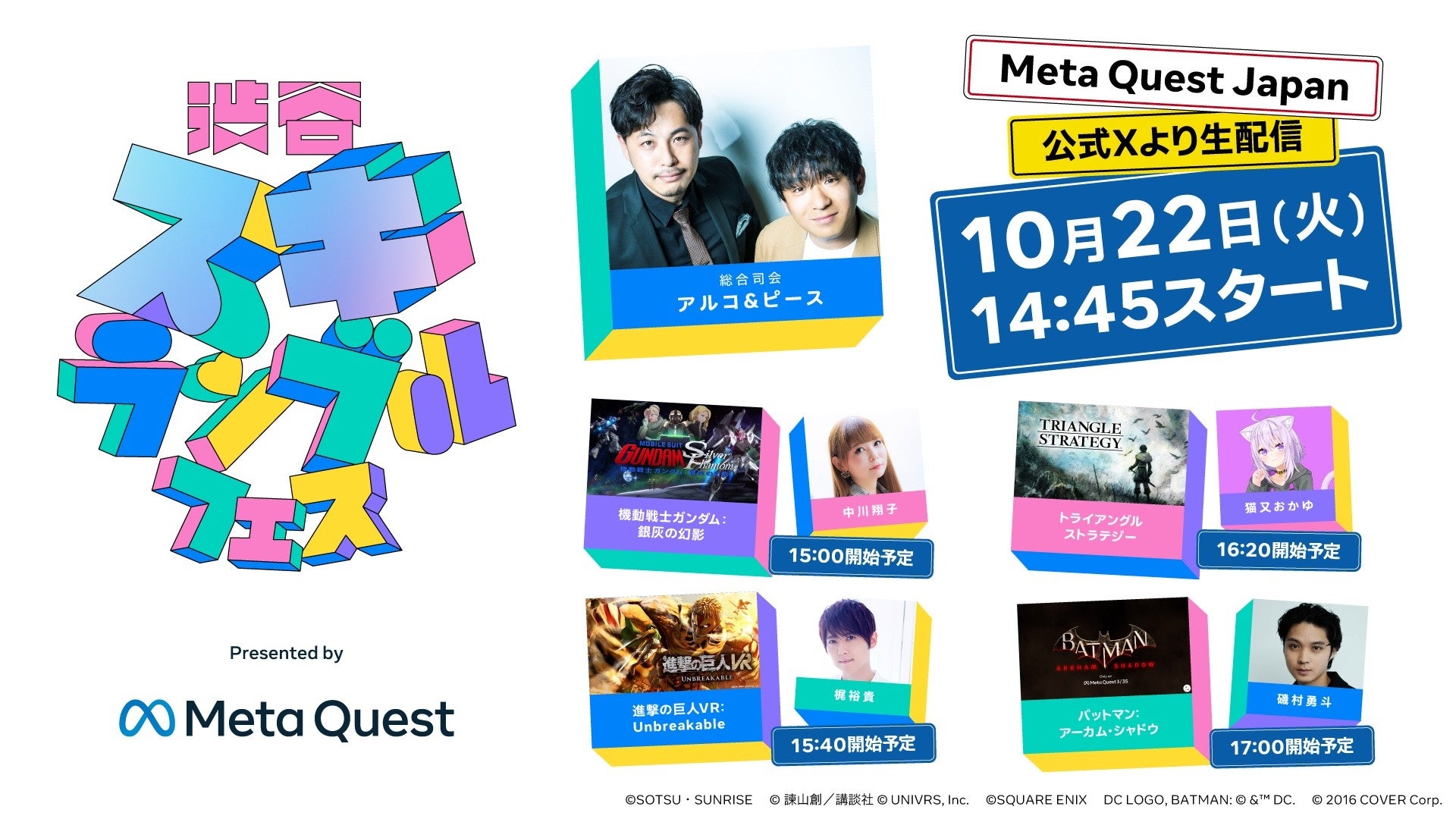 この秋冬にVR化されMeta Questに登場する人気のコンテンツ4作品にフォーカスをあて、1Dayのトークイベント「渋谷スキランブルフェス」を10月22日(火)に開催し、Meta Quest JapanのX公式アカウント(@MetaQuestJapan https://x.com/MetaQuestJapan?ref_src=twsrc%5Egoogle%7Ctwcamp%5Eserp%7Ctwgr%5Eauthor )より生配信します。