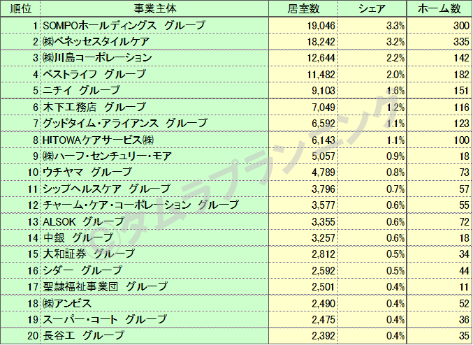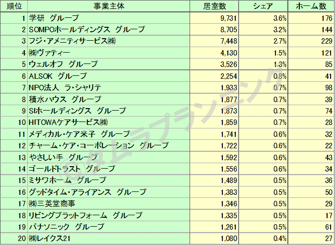 その他のランキング上位では、16位のグッドタイム・アライアンス グループが、先述の(株)アーバンアーキテックのグループ化のため、また18位のリビングプラットフォーム グループがブルー・ケア(株)を子会社化して、新規開設含め供給戸数が大幅に増加しており、それぞれ昨年より1,053戸/43ヶ所、594戸/6ヶ所増加しています。