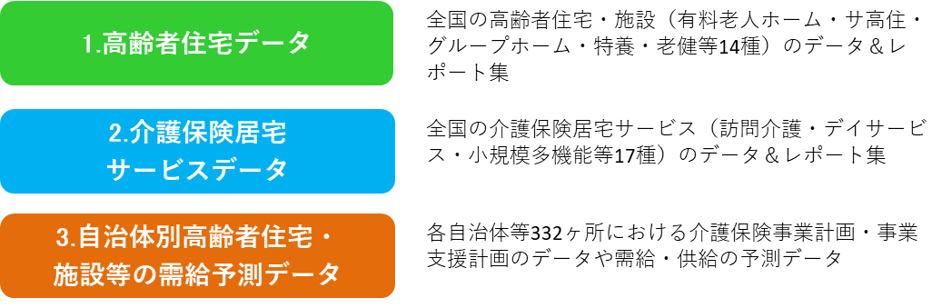 このデータは、全14種類・5.7万ヶ所の高齢者住宅・施設の整備状況をまとめ、そのタイプ別の有料老人ホームやサ高住の開設状況や業界動向など、市場分析や調査に活用できます。