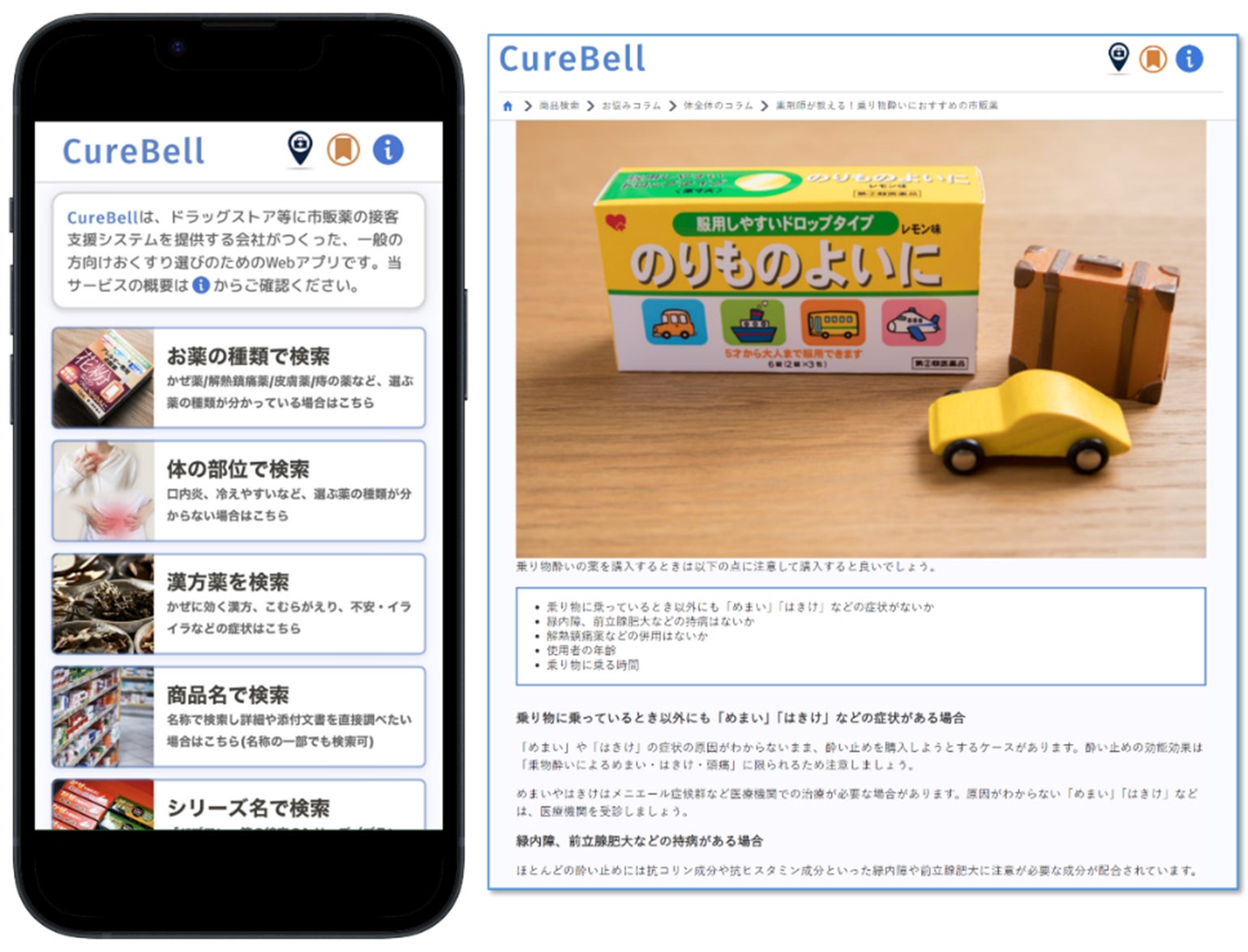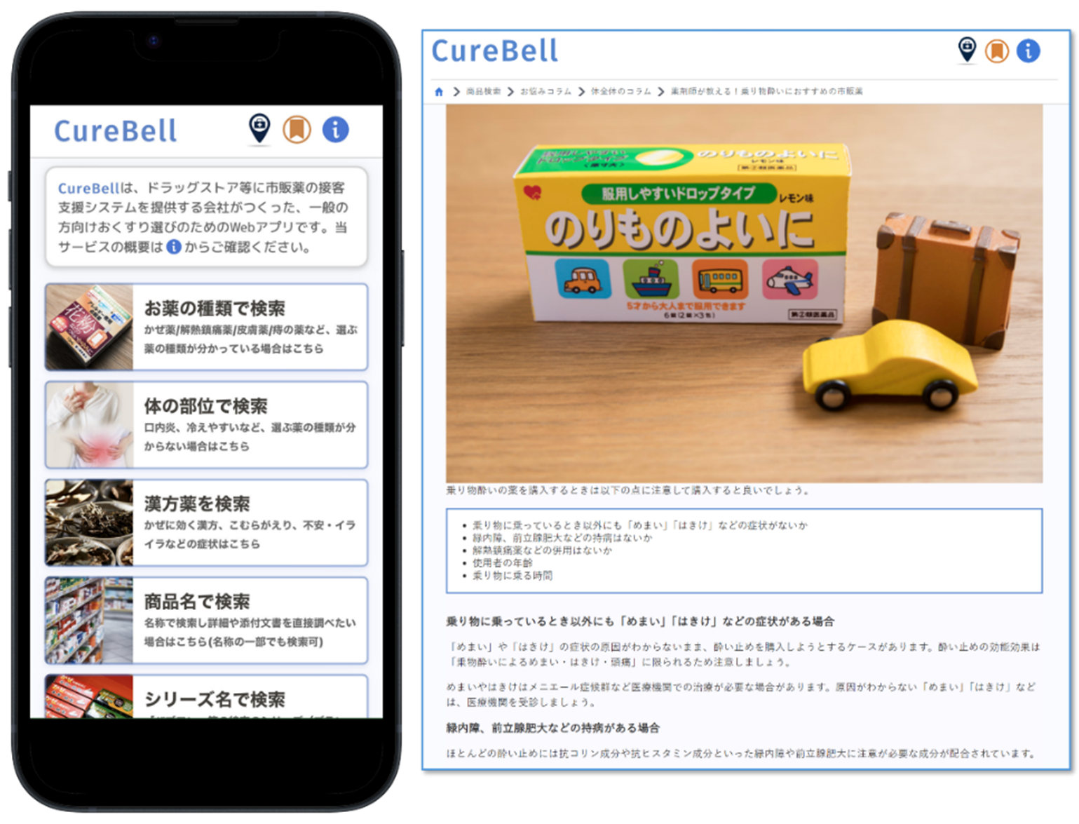 ※上記サイトは、当社が生活者向けに提供しているOTC選定支援WebアプリCureBell(キュアベル:https://curebell.jp/ )と連携しており、上記サイトにて提示している各OTC医薬品の詳細情報、添付文書等が参照できます。CureBellはOTC医薬品1000種以上を網羅しており、カテゴリーや服用者の対応範囲、参考価格等さまざまな観点での各薬局に合った商品の選定に役立てることができます。
