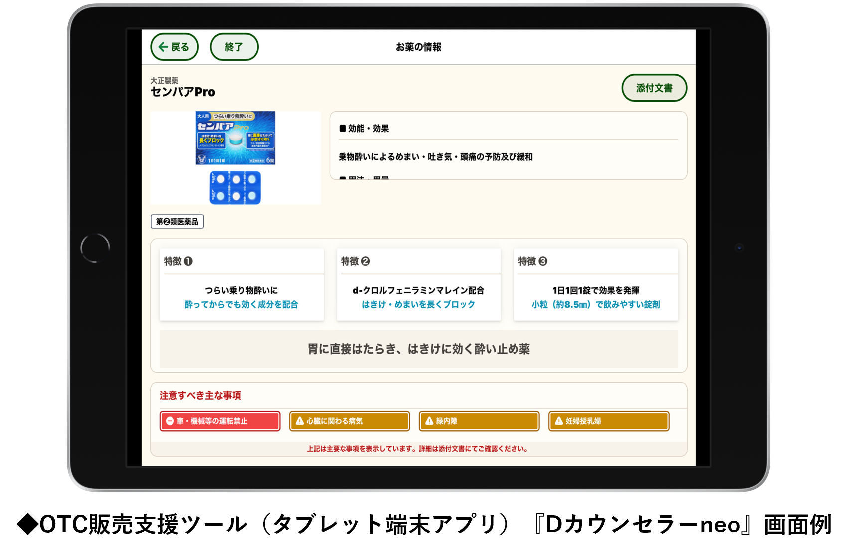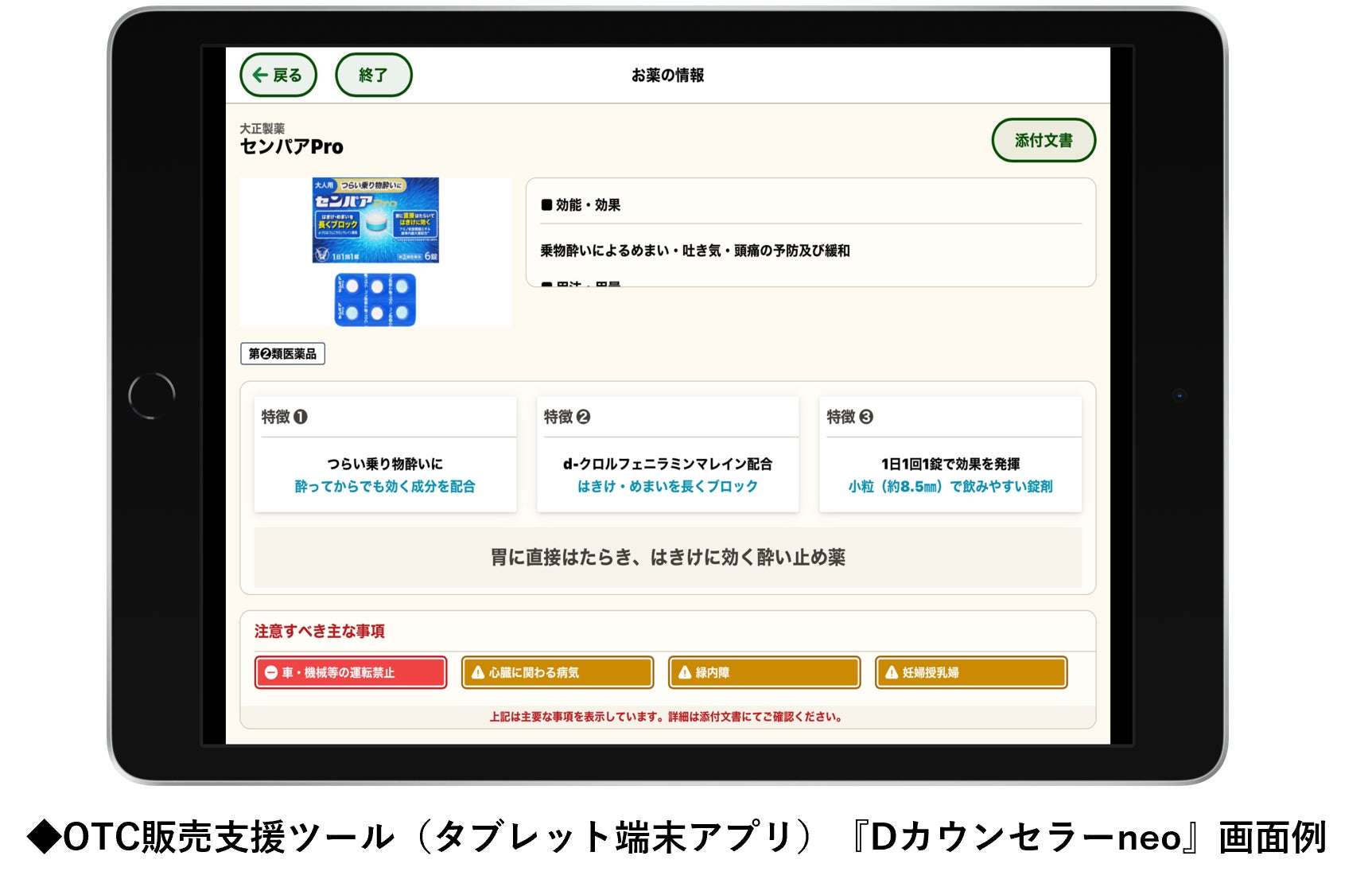 当社は、保険薬局が選定、備蓄したOTC医薬品をしっかり売り切ることを支援すべく、ドラッグストア等1,600店が導入するOTC販売支援ツール(タブレット端末アプリ)『Dカウンセラーneo』( https://www.willbase.co.jp/service/dcounselor.html )を保険薬局に提供します。Dカウンセラーneoを活用すると、来局者に対するOTC医薬品の詳細情報の提供や薬剤師による詳細な説明が促進でき、選定・備蓄した商品をロスすることなく適切に販売することが可能となります。